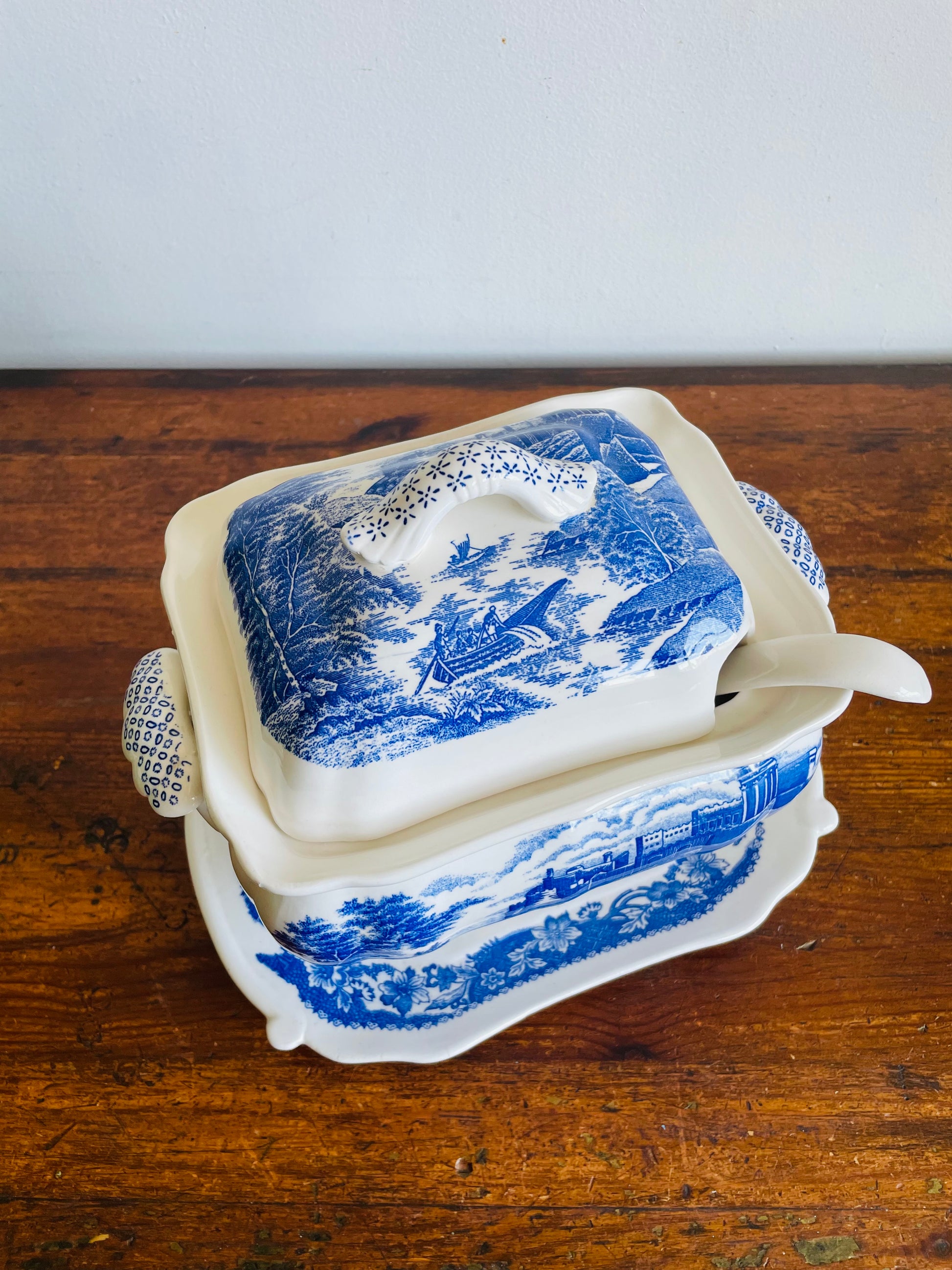 Vintage Large Blue & White Transferware Soup Tureen with Tray, Lid & Ladle with River Castle Scene - 4 Pieces