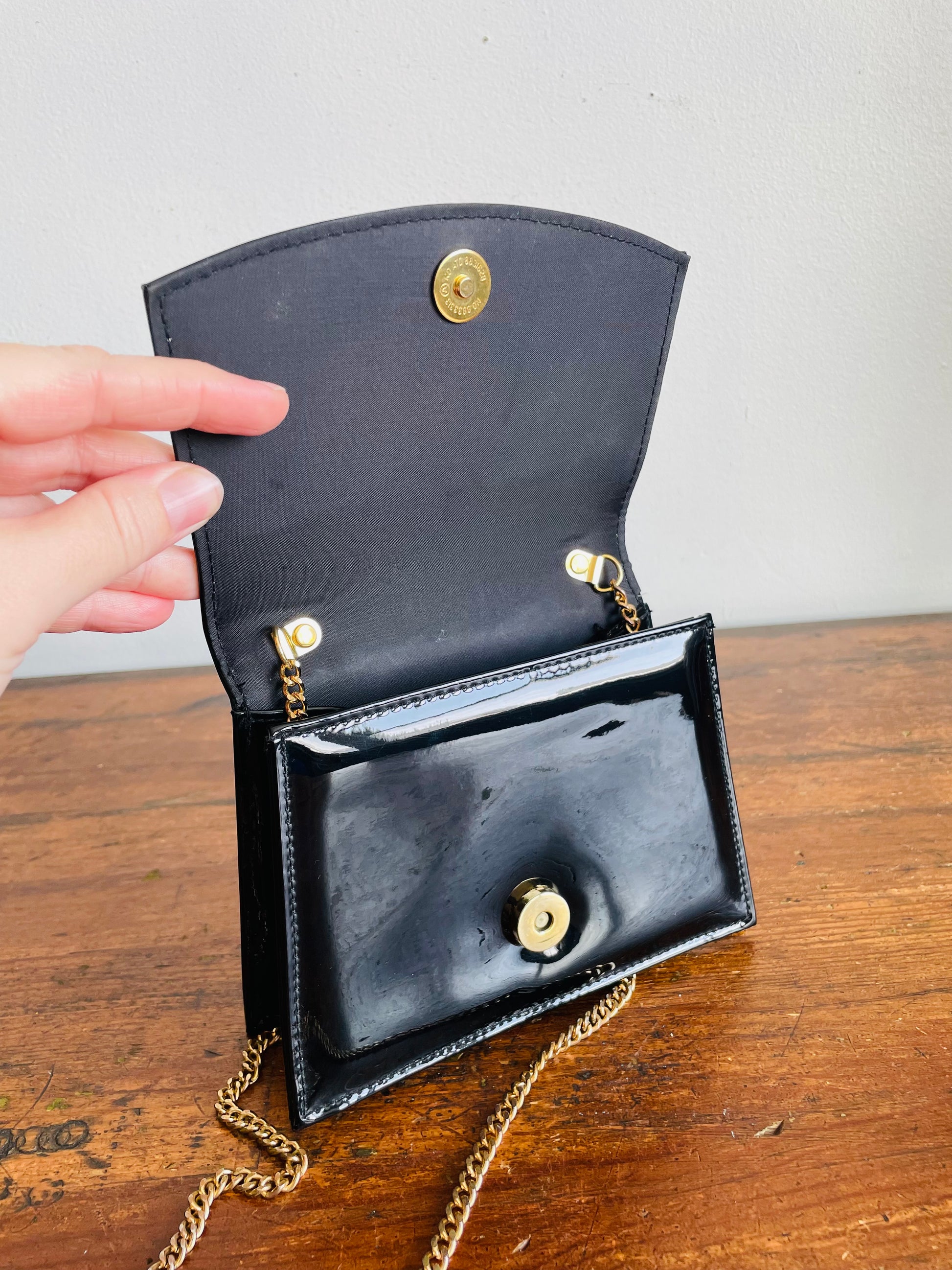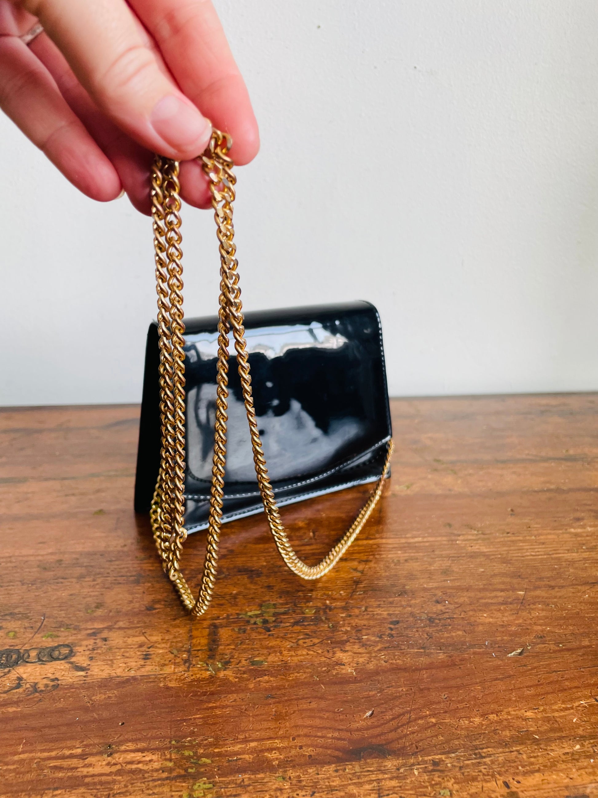 Vintage Little Black Patent Leather Crossbody Clutch Purse on Long Brass Gold Chain