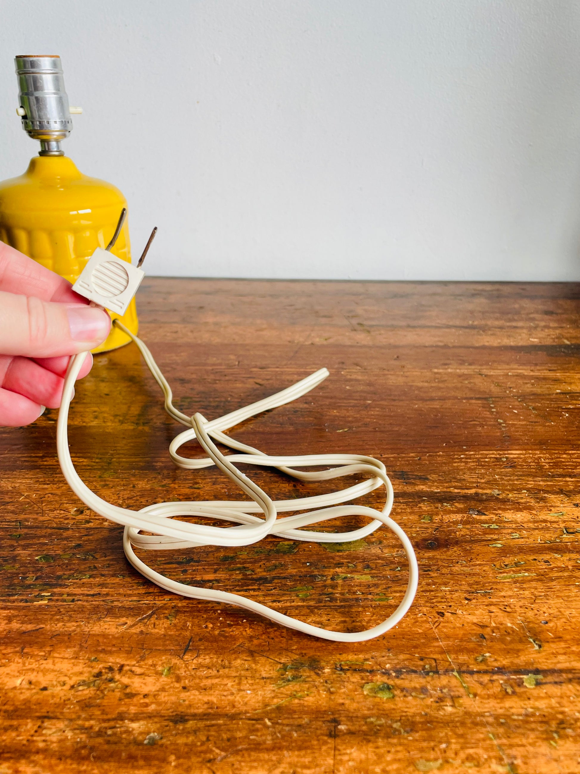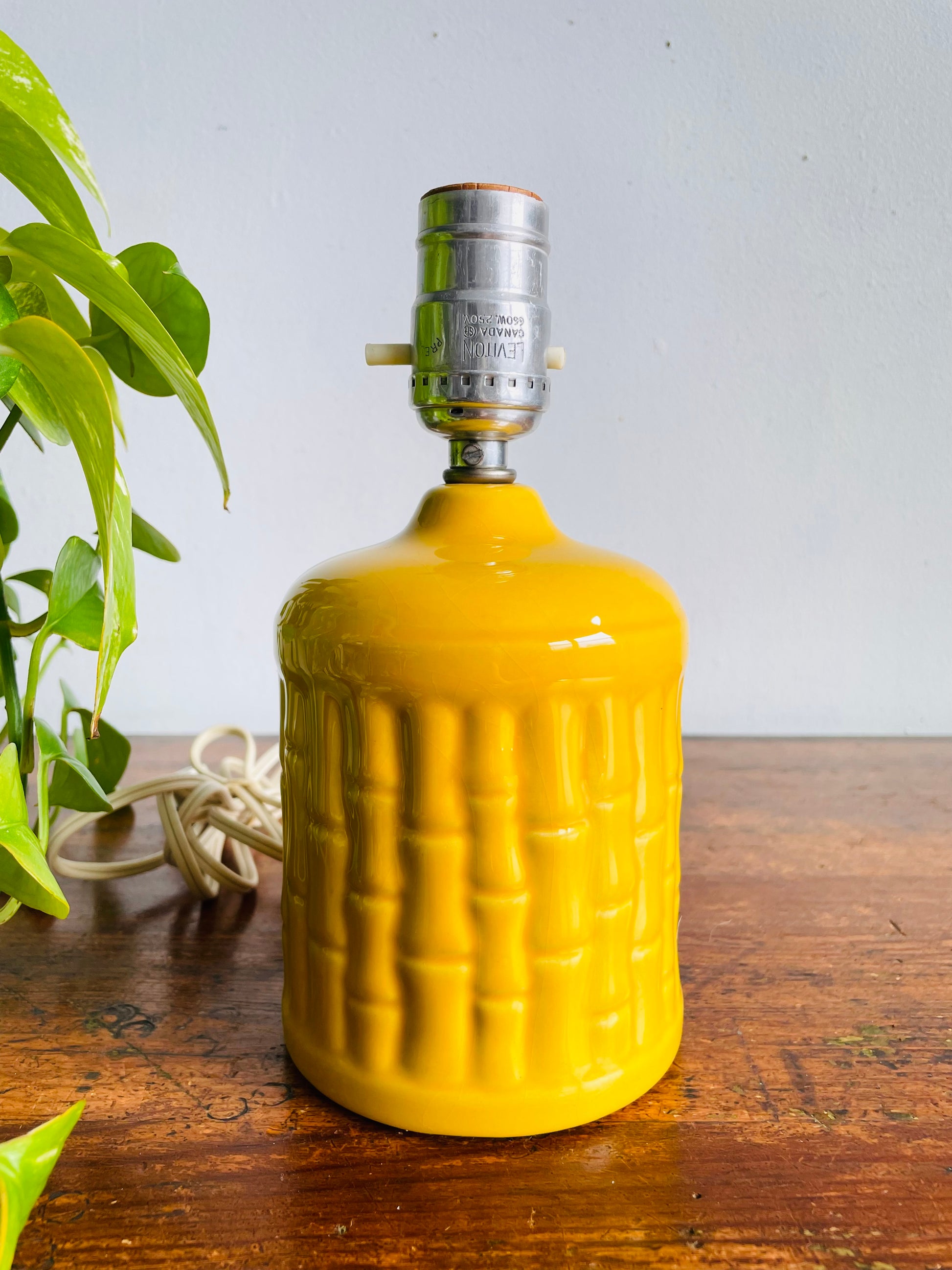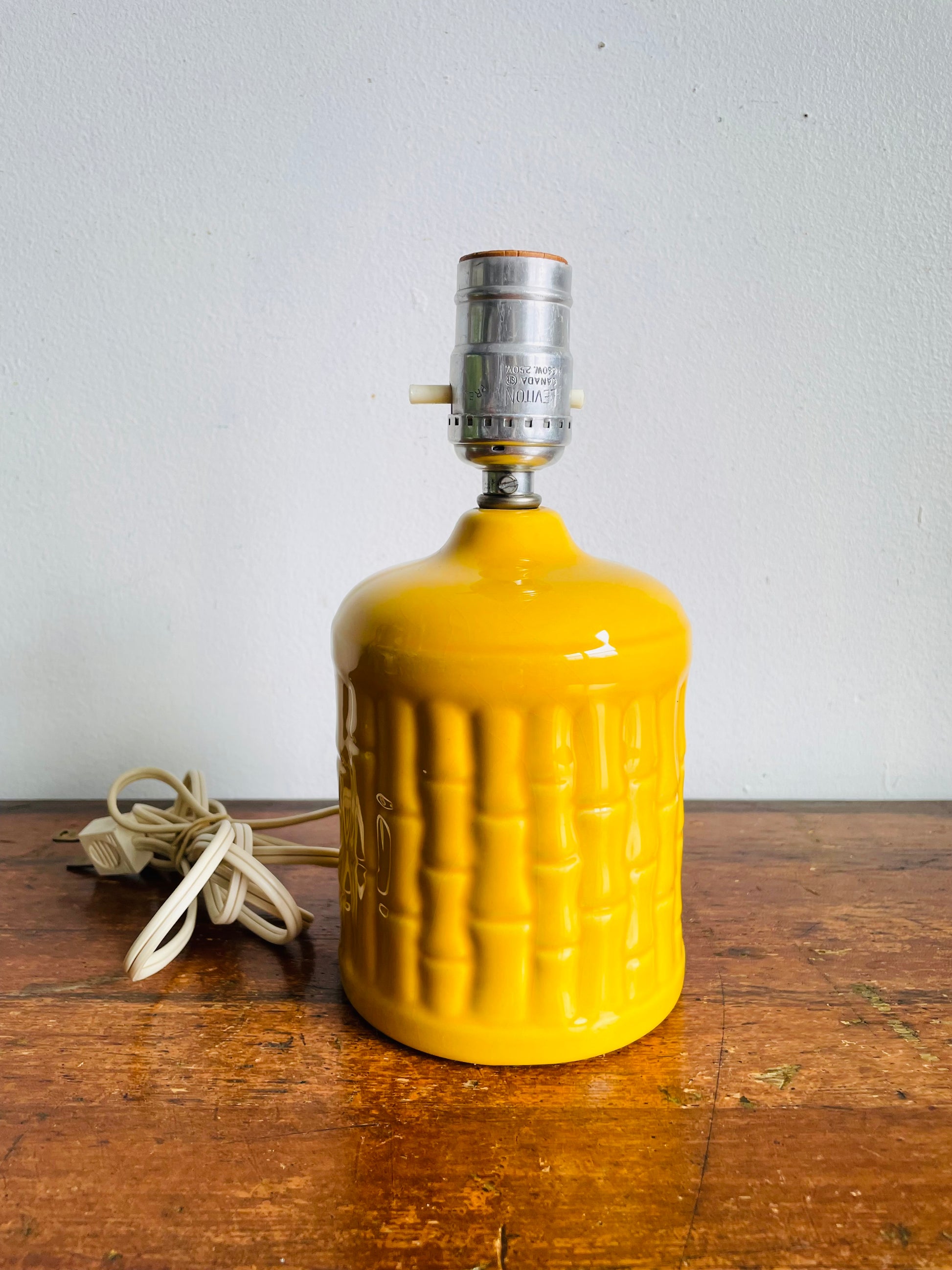 Vintage MCM Leviton Canada Bright & Cheerful Yellow Ceramic Table Lamp with Bamboo Textured Pattern