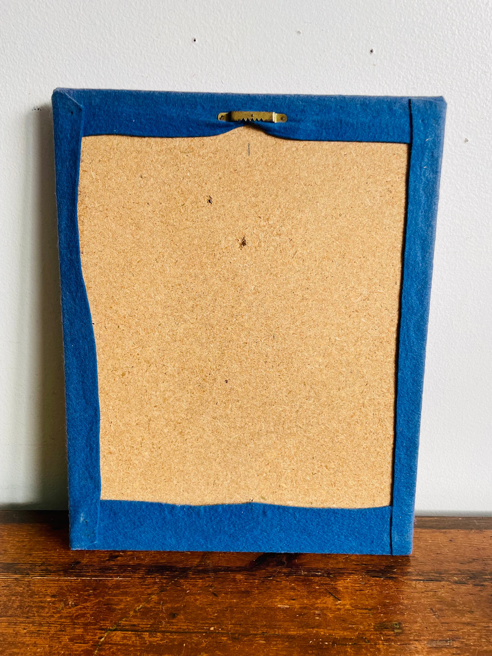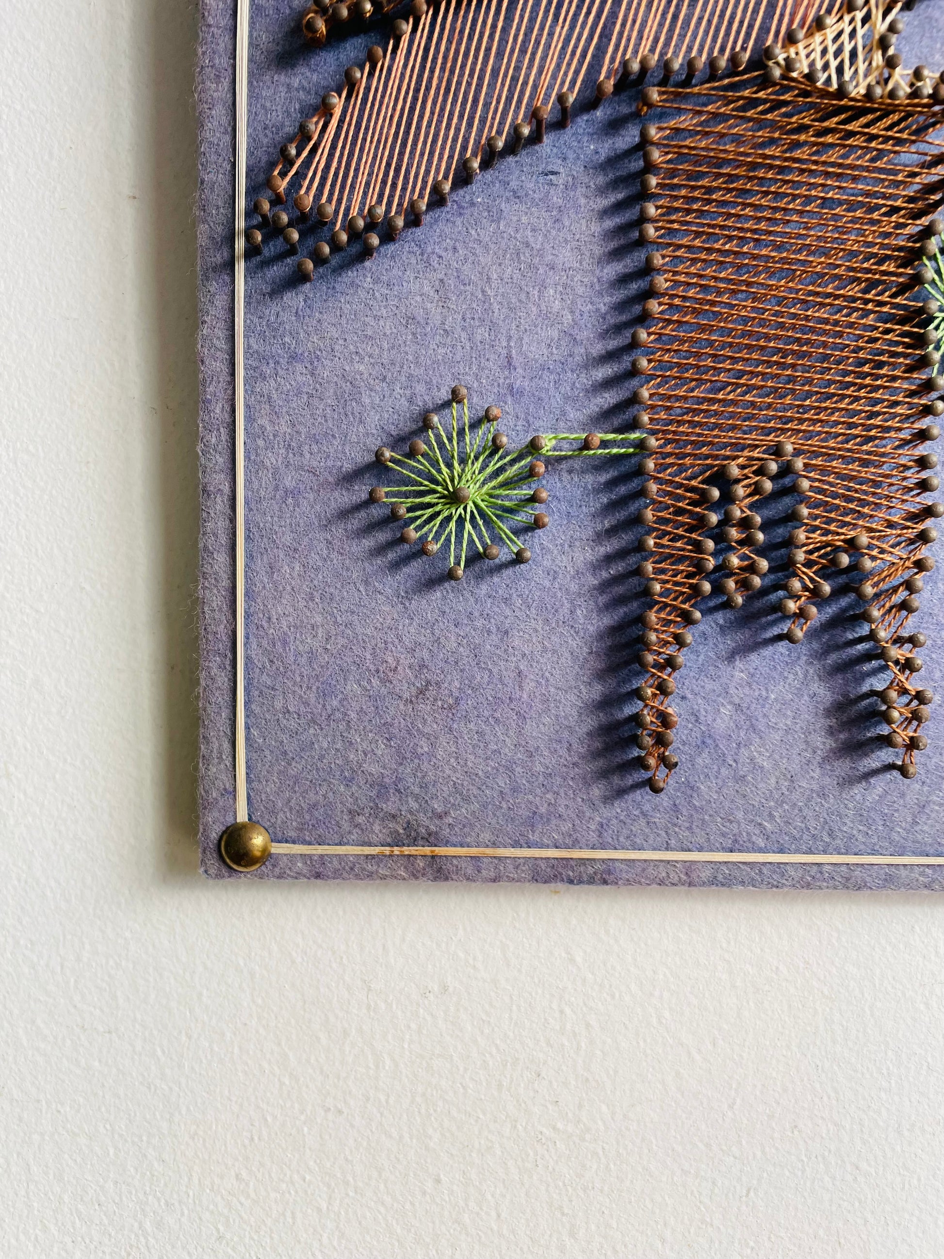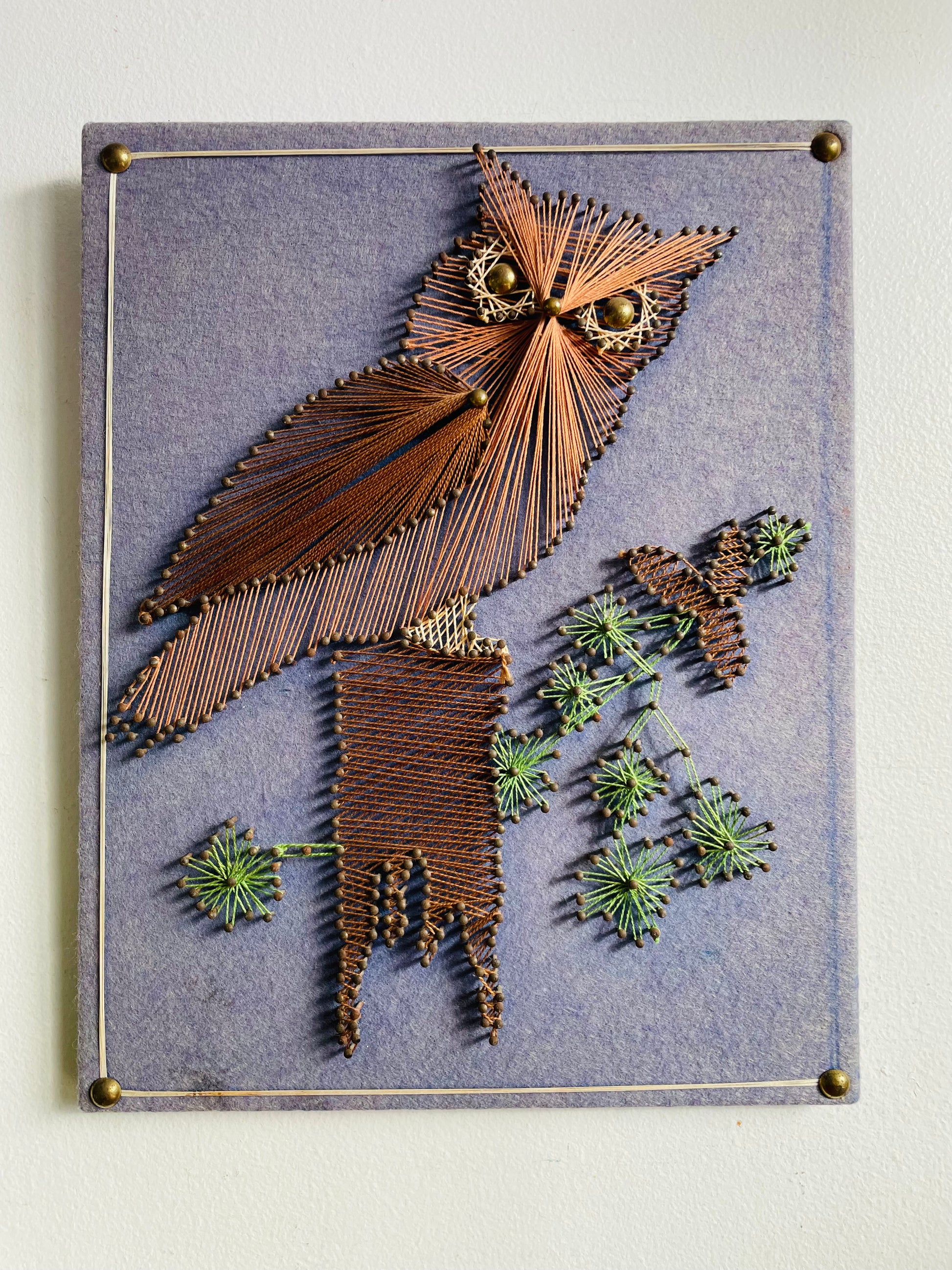 A very solid board which is covered in blue felt and has nails with string to create this owl art piece. There is a hook on the back for hanging.