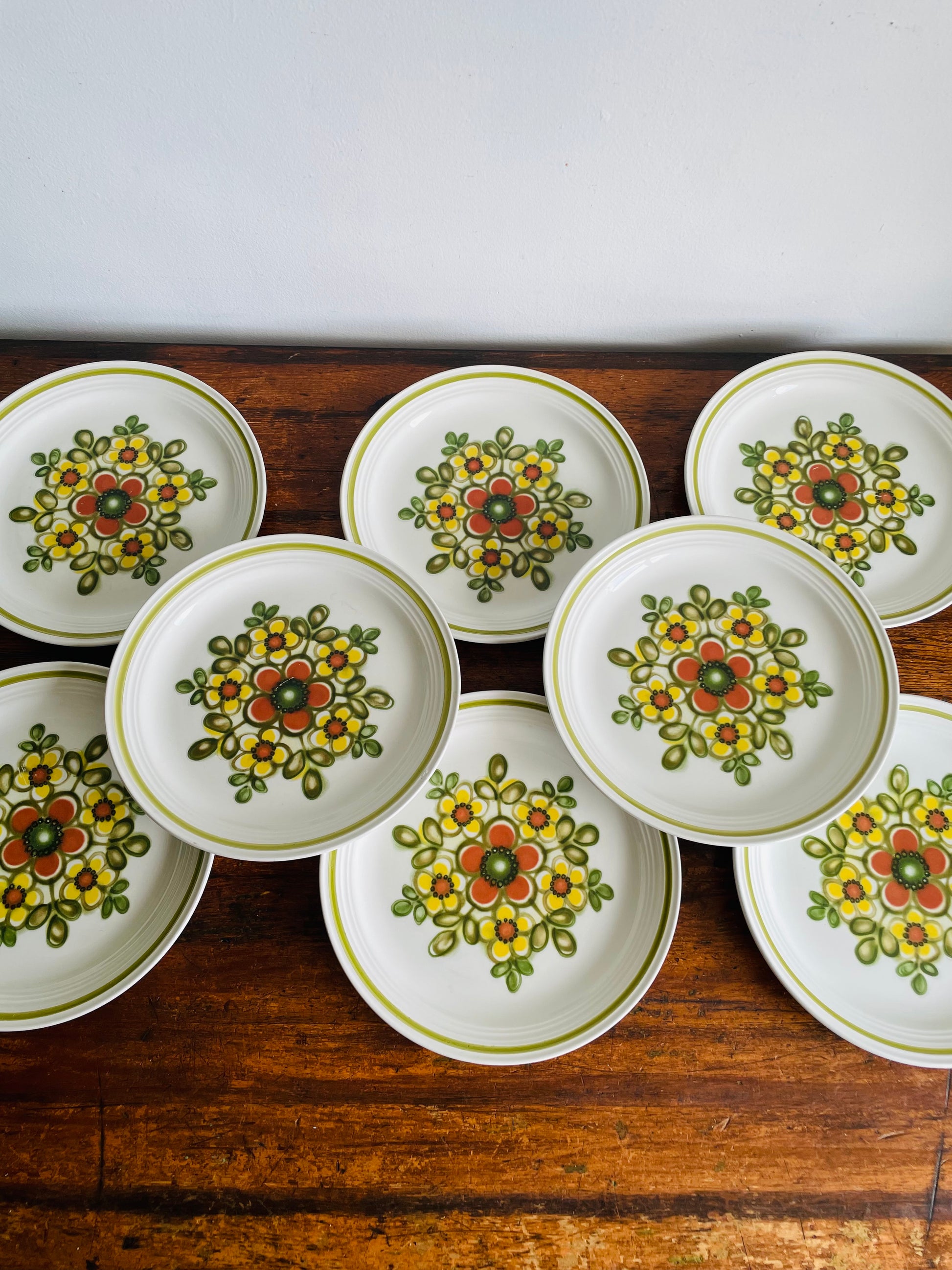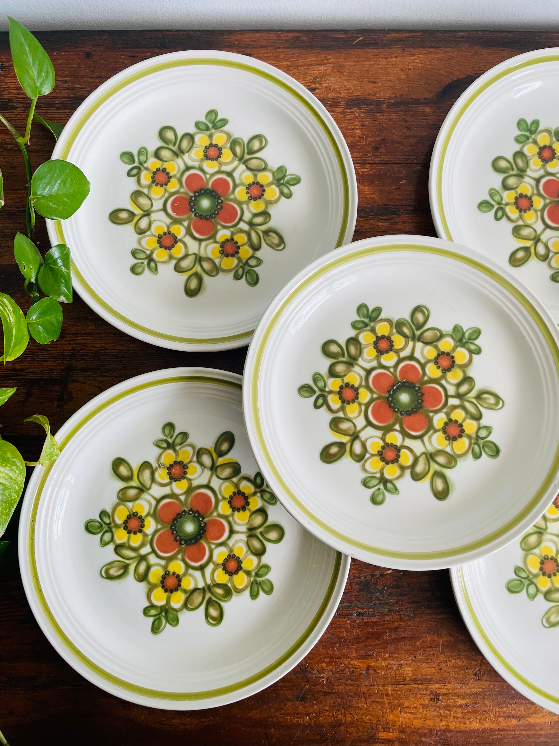 Vintage 10" Dinner Plates with Groovy Orange, Yellow & Green Flower Power Pattern - Set of 8 - Made in England