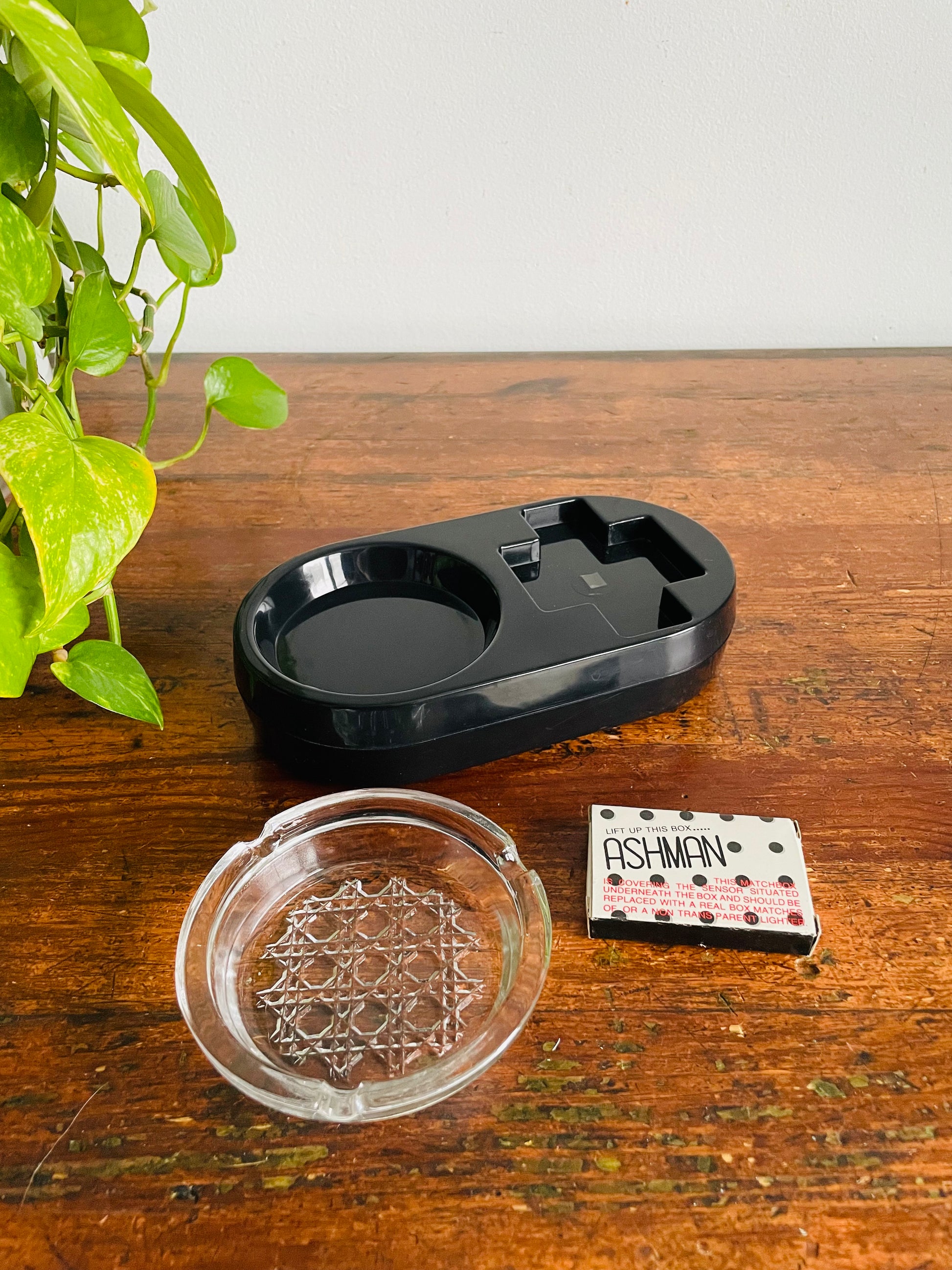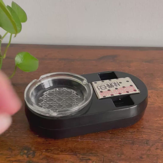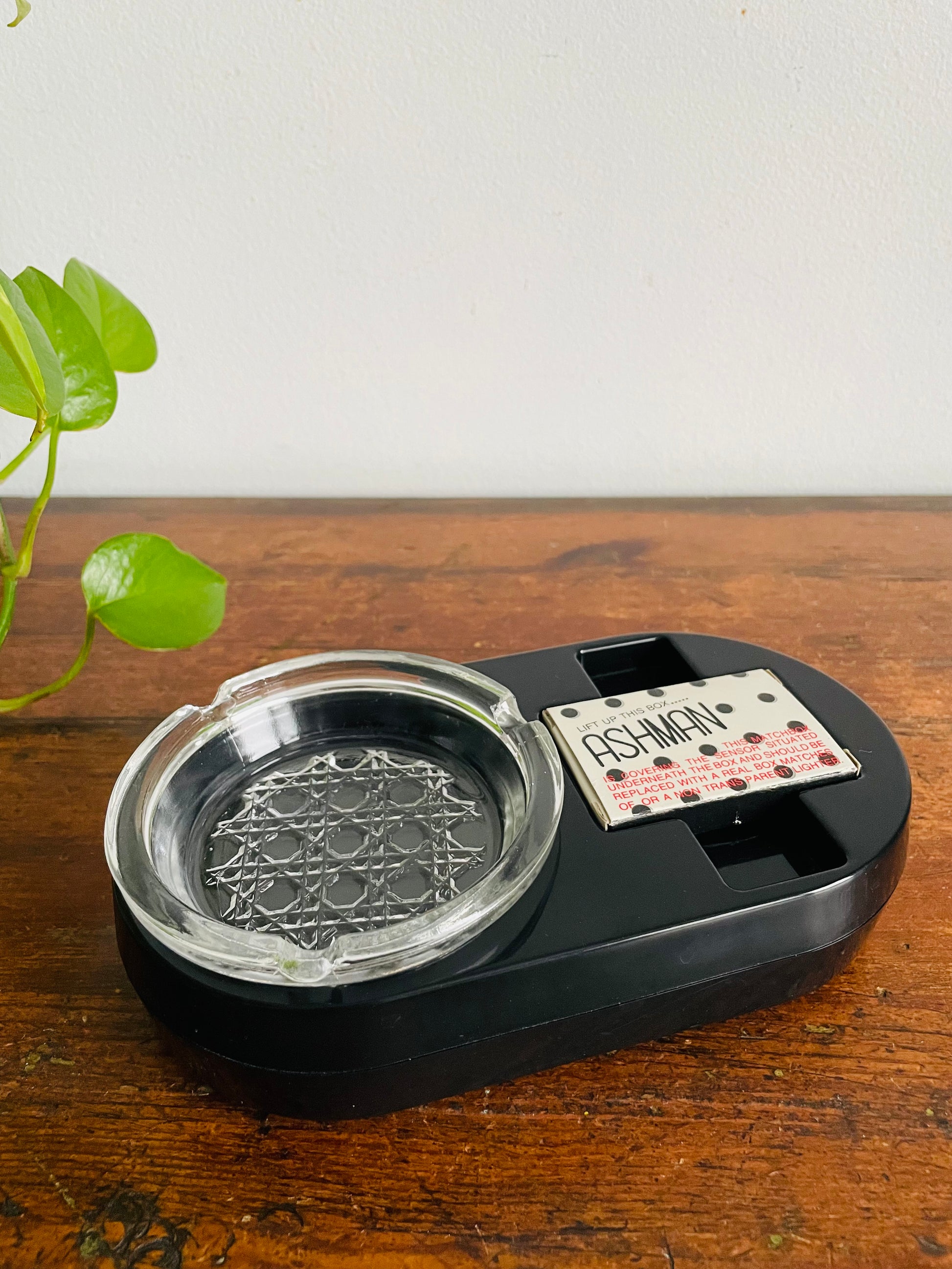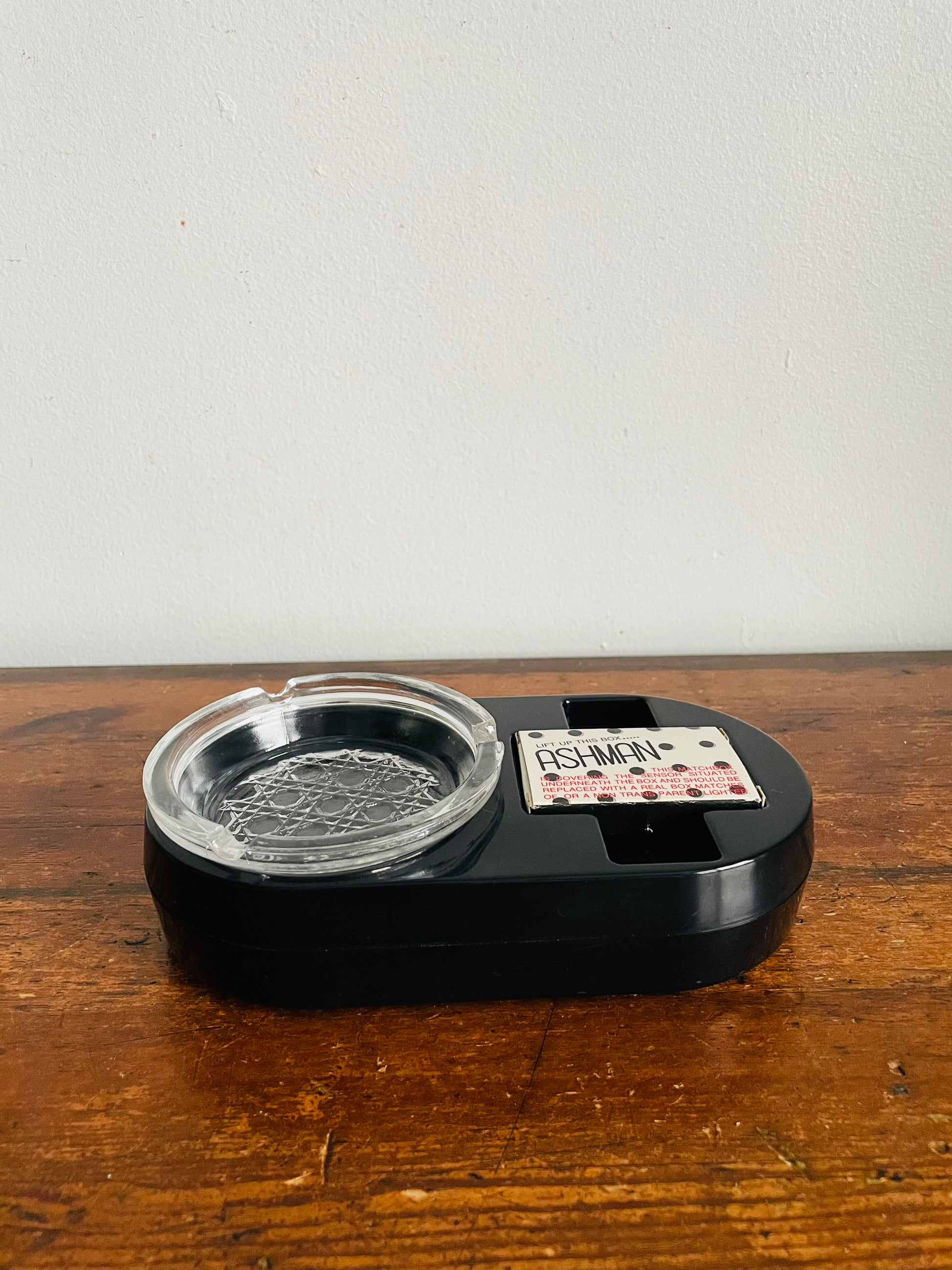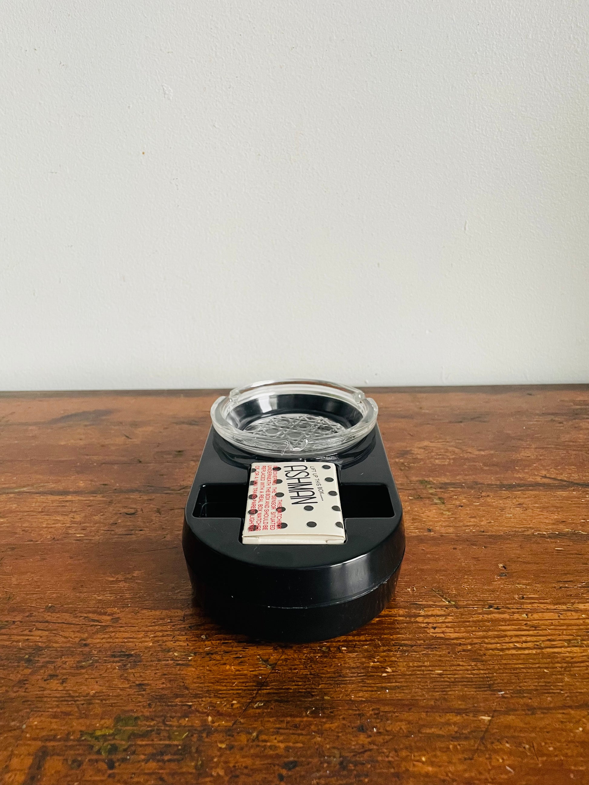 The matchbox covers a sensor and you can replace it with another matchbox or a non-transparent lighter. When someone goes to pick up the matches or lighter, the ashtray will start to cough and it yells; "No Smoking!". See video at the end of the photo gallery.