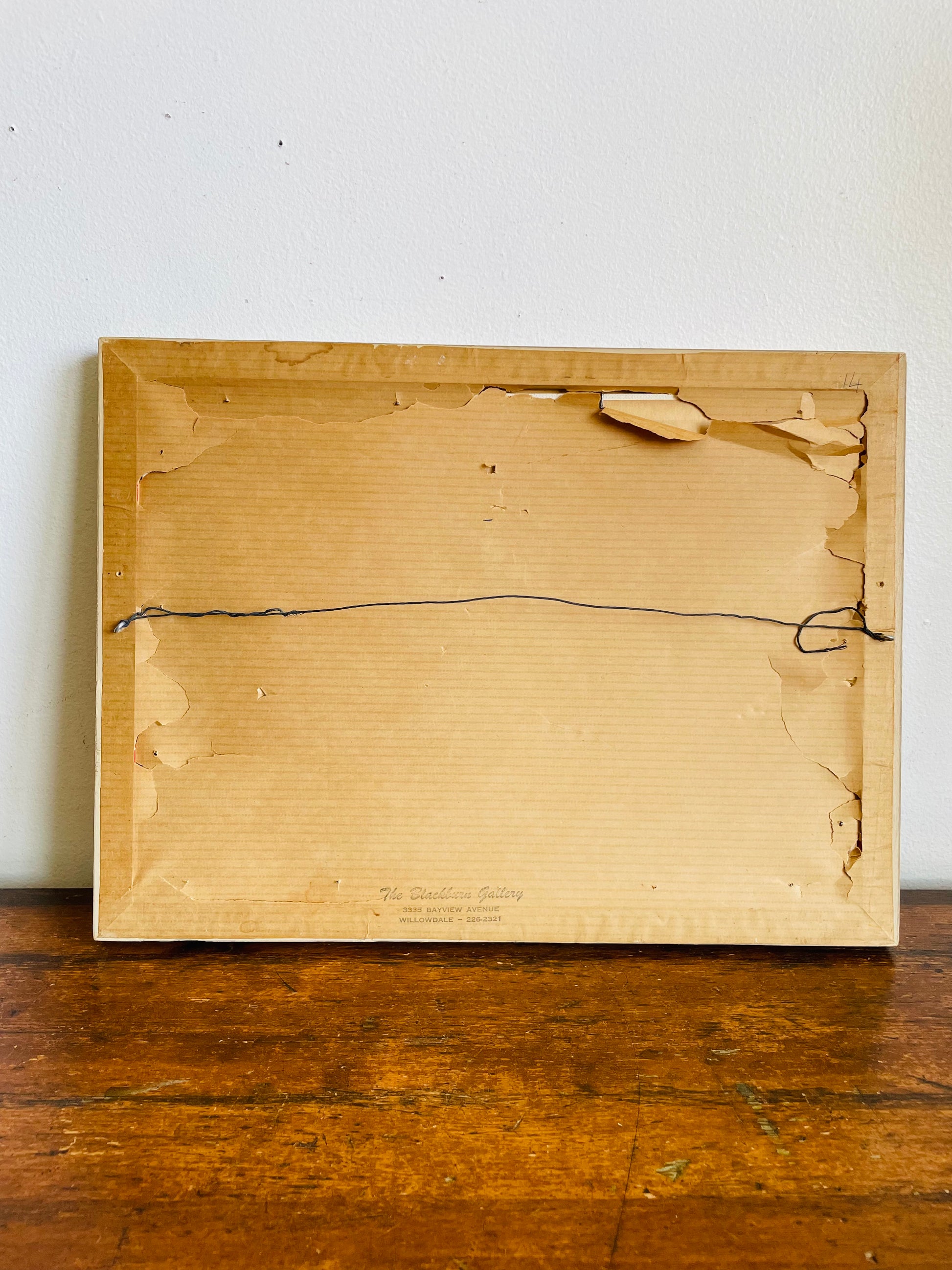A gorgeous painting that sits in a wood frame. There is a wire on the back for hanging.