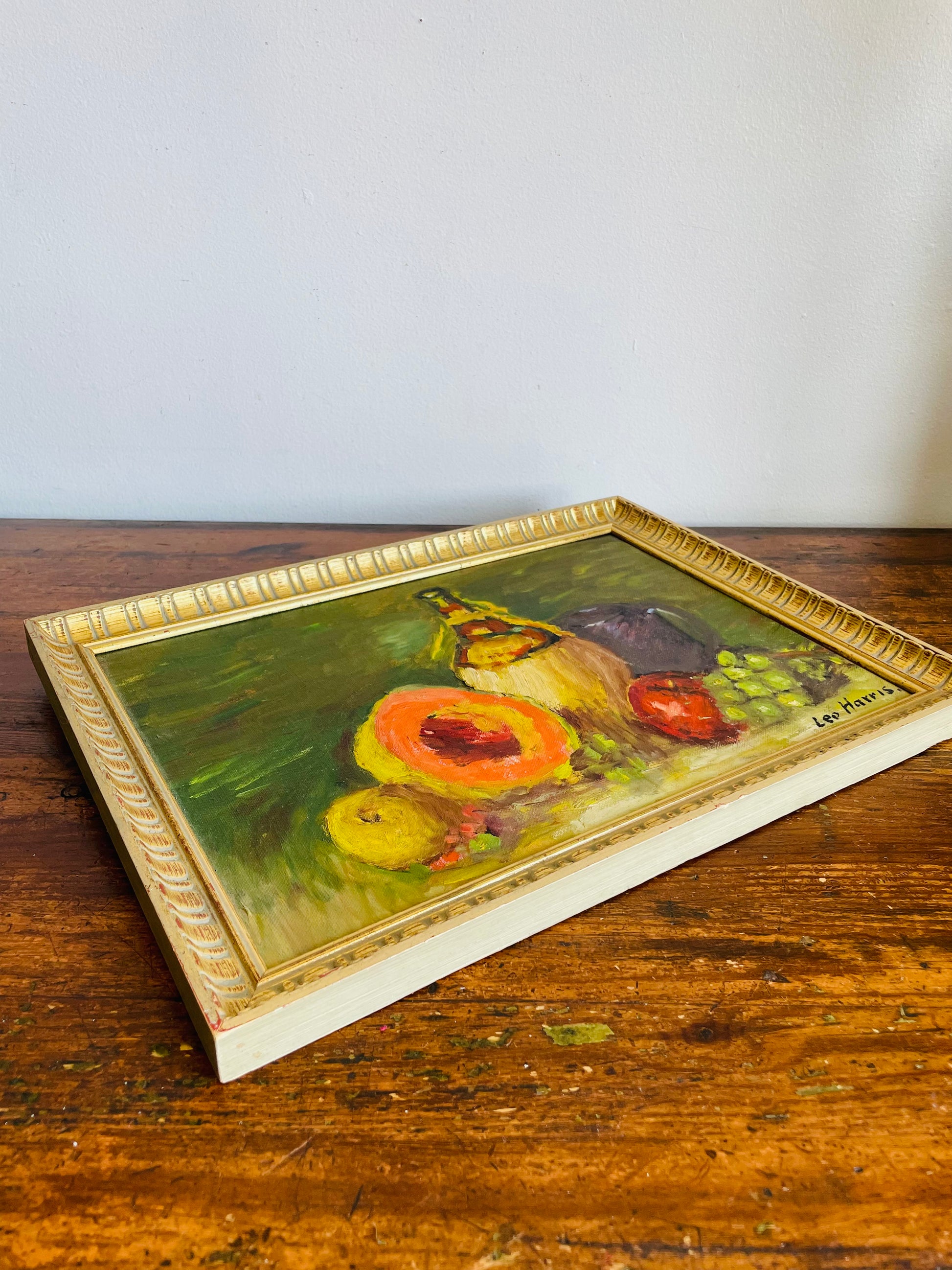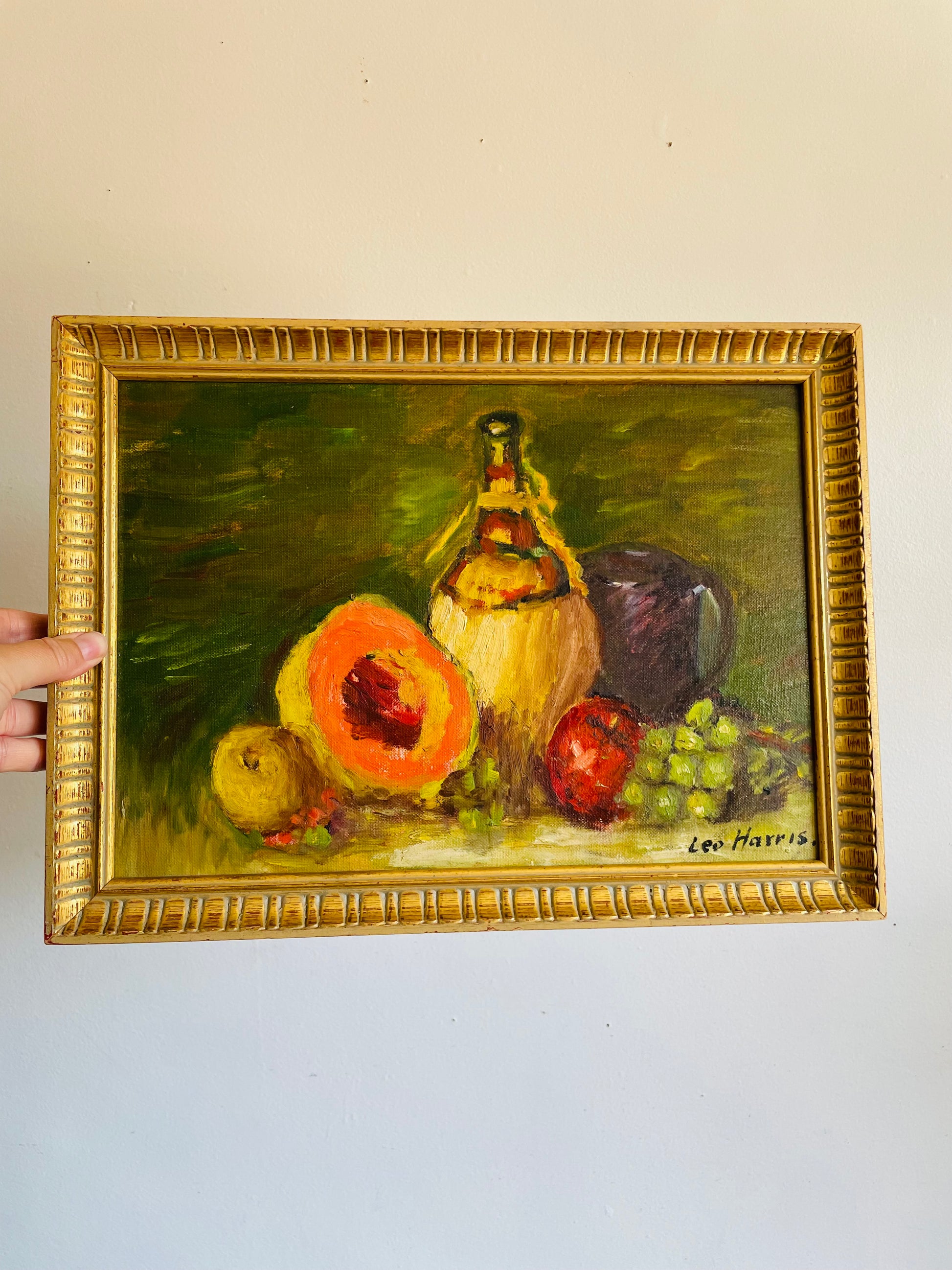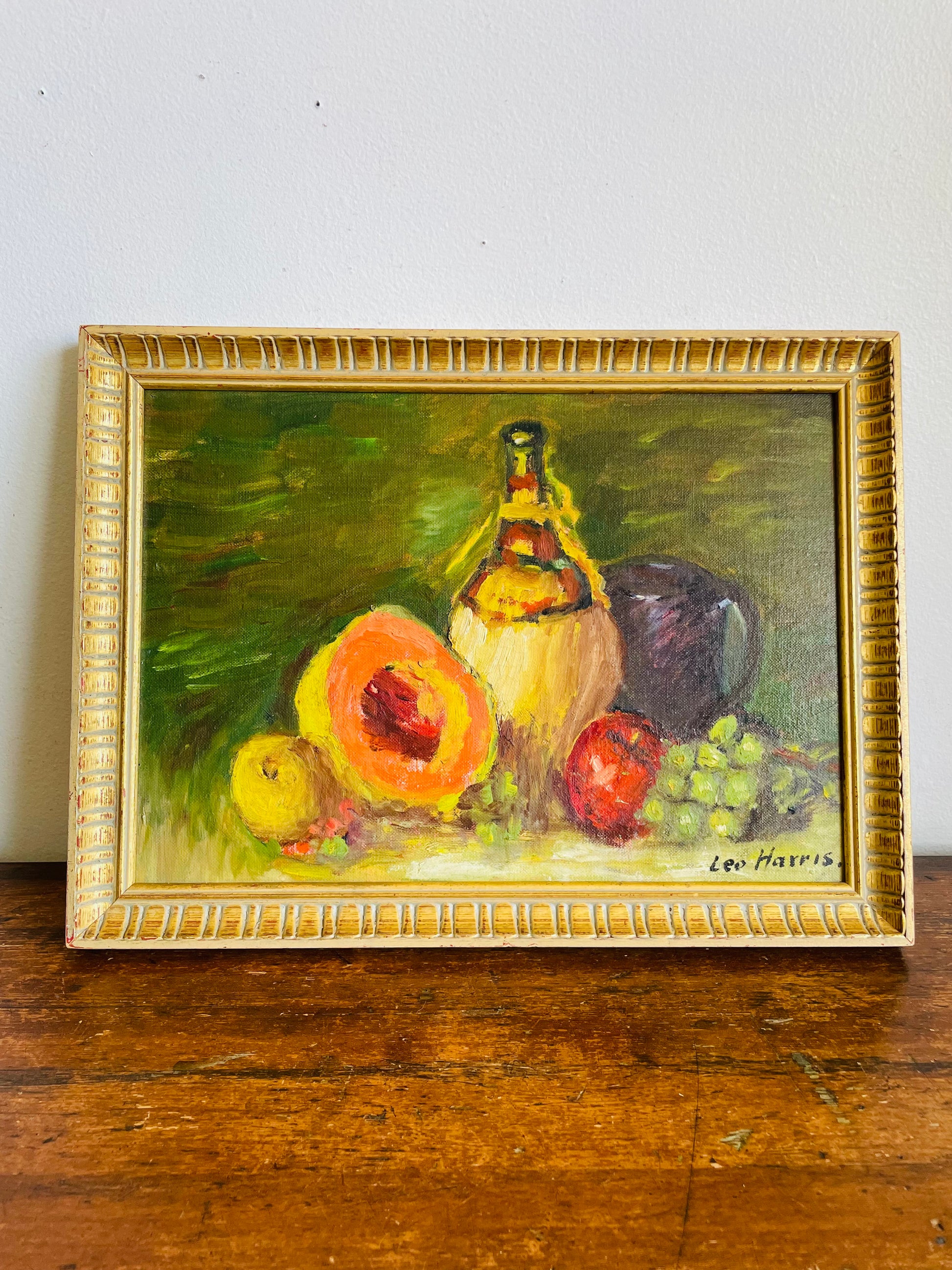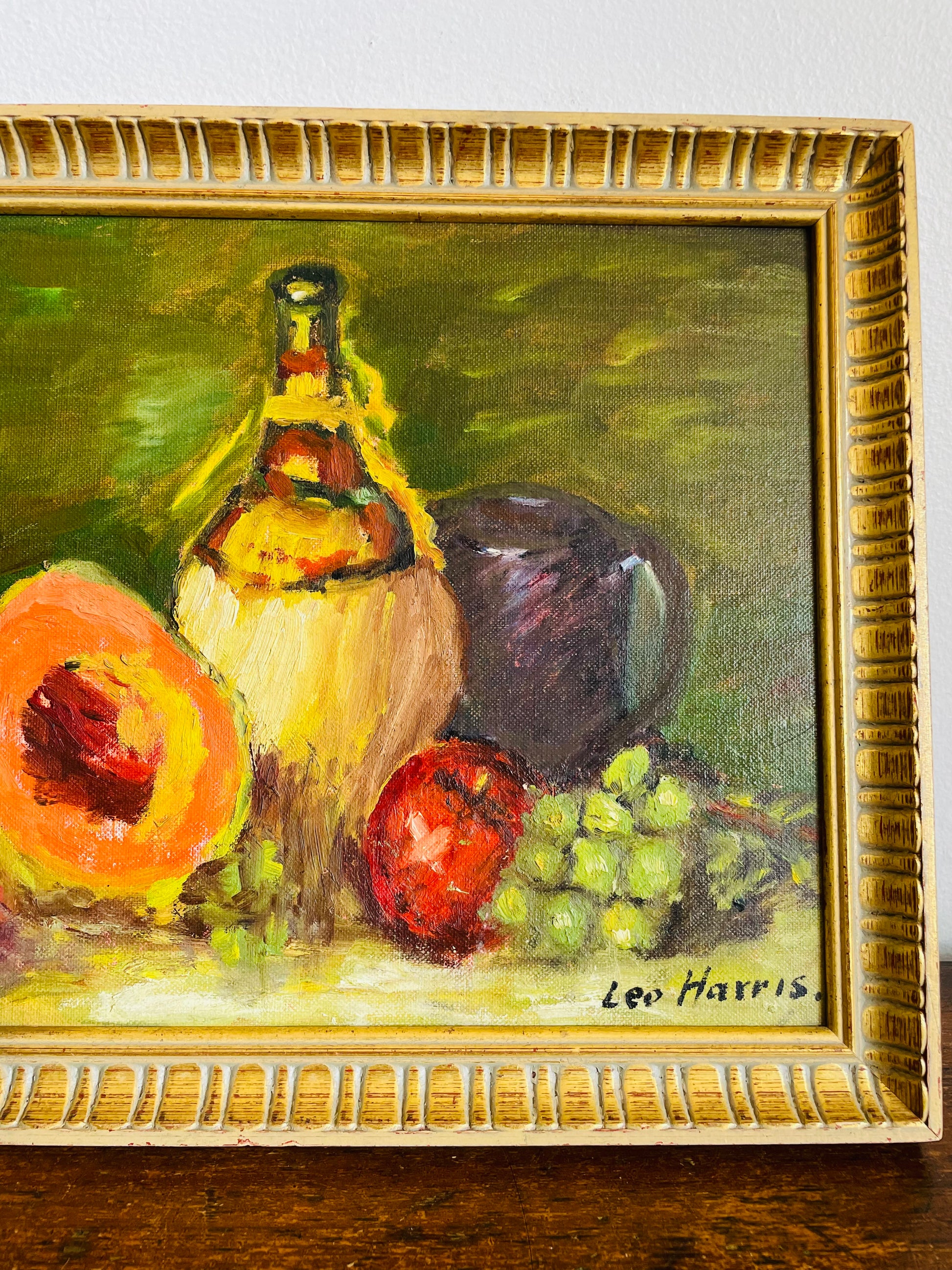 Vintage Original Art Painting of Still Life Scene with Cantaloupe, Other Fruit & Wine Jug - Signed Leo Harris
