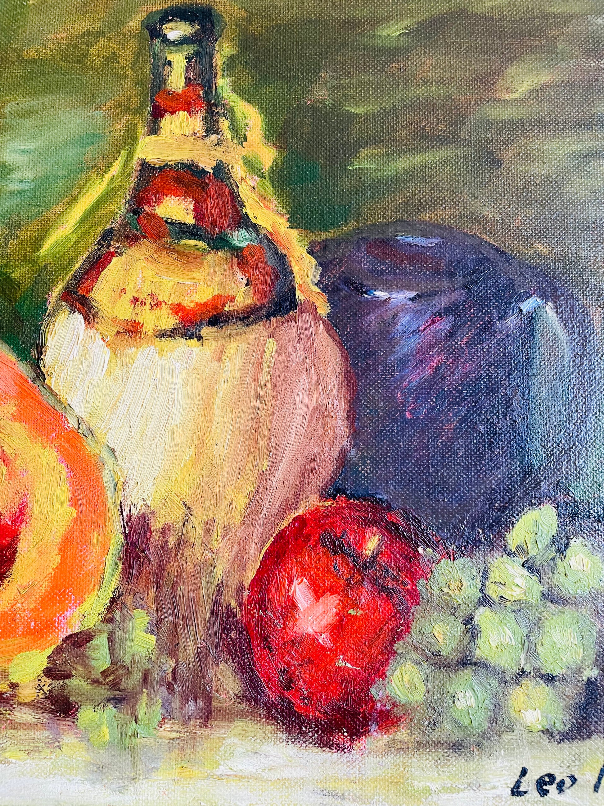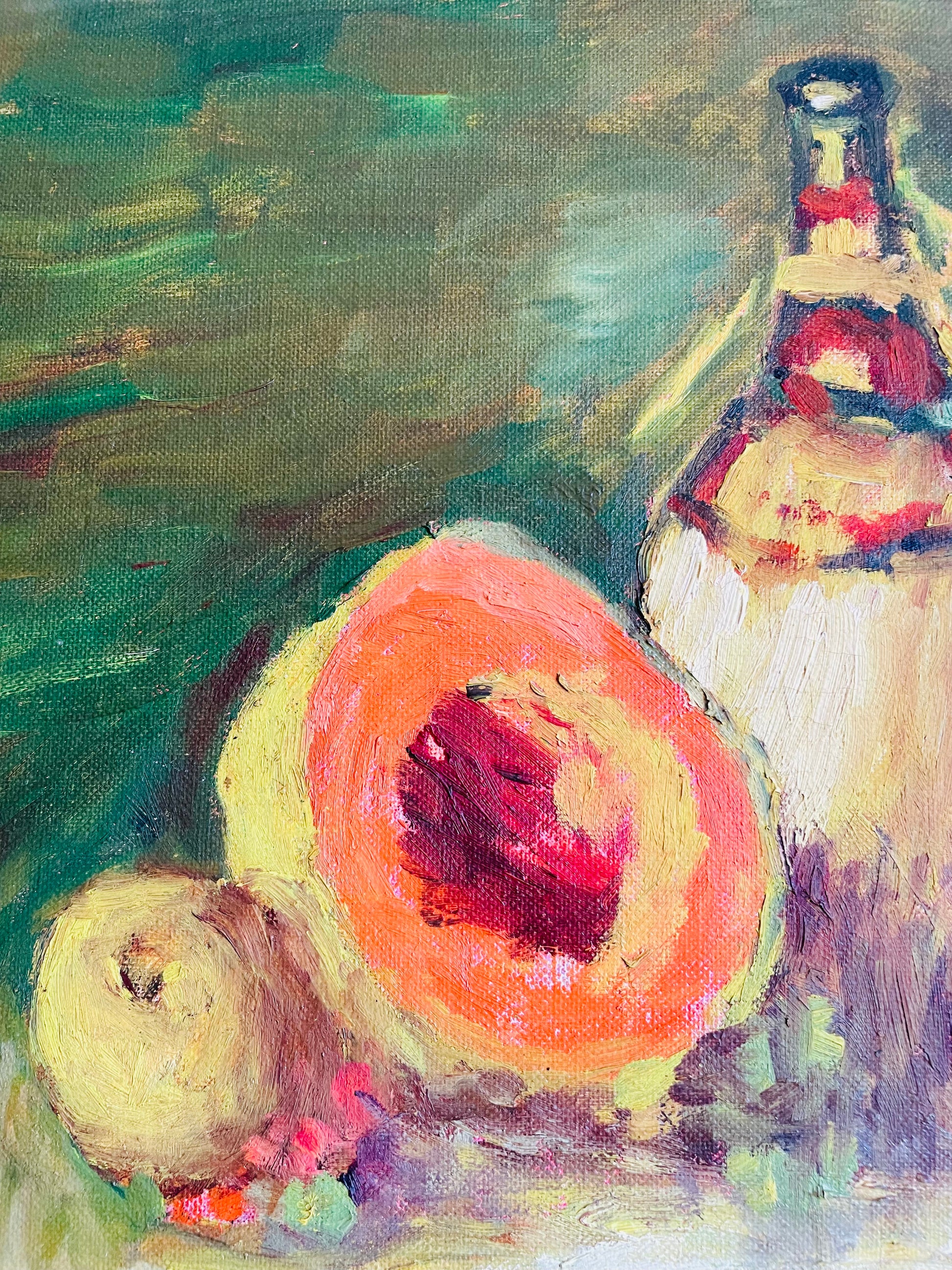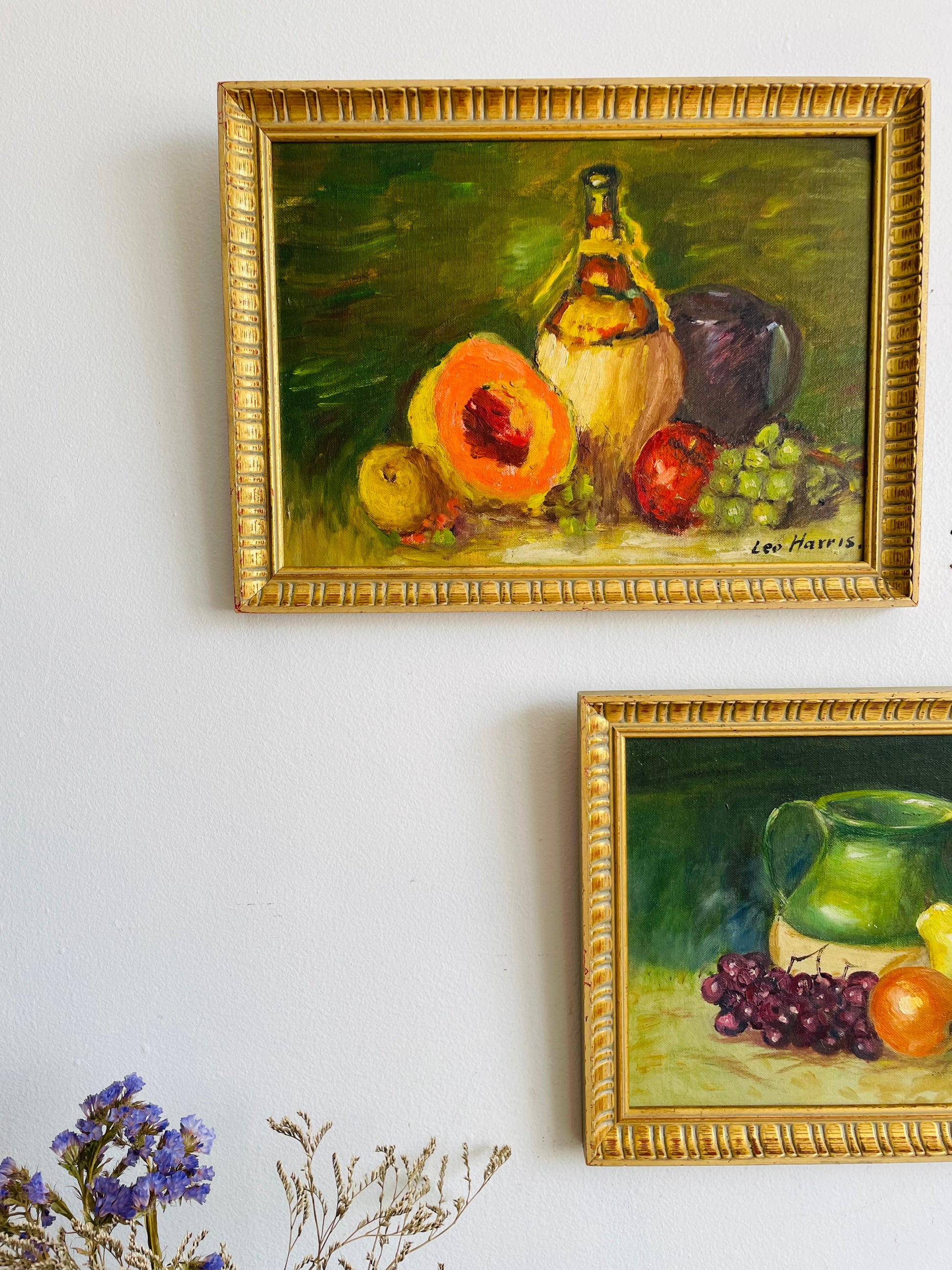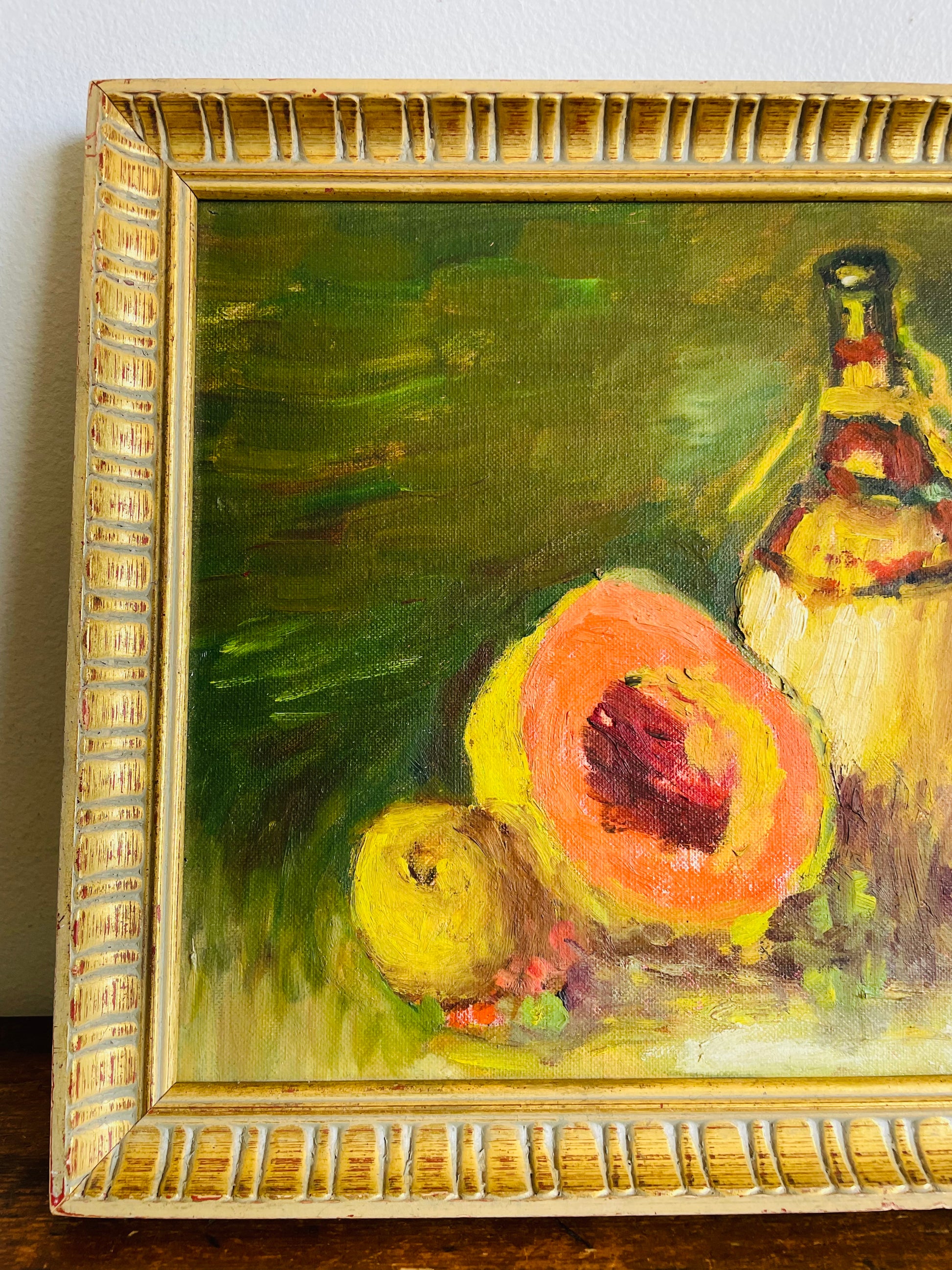 Vintage Original Art Painting of Still Life Scene with Cantaloupe, Other Fruit & Wine Jug - Signed Leo Harris