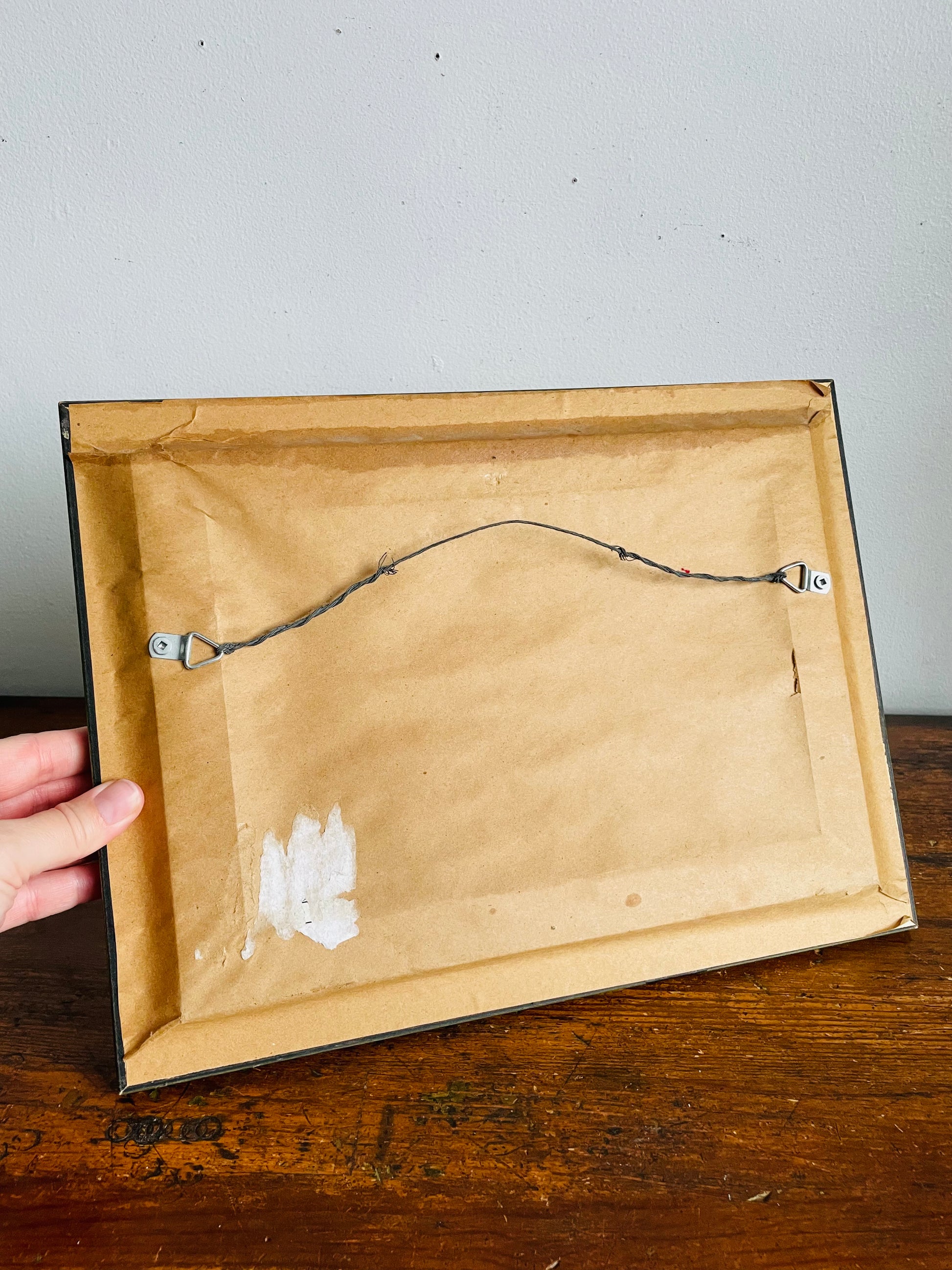 Framed in a wood frame with a built-in mat. There is a wire on the back for hanging.