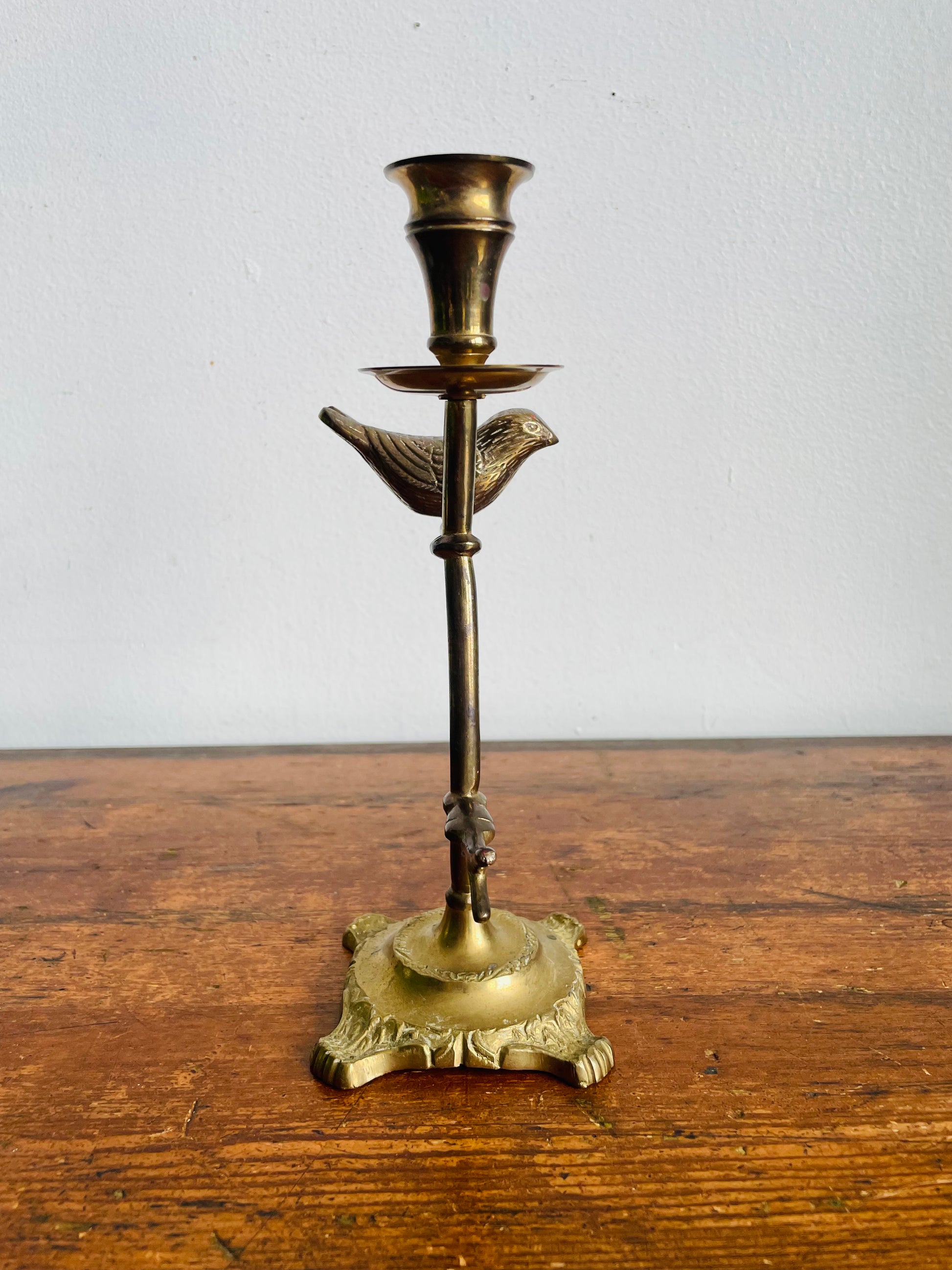 Vintage Solid & Heavy Brass Candle Holder with Branches & Perched Bird on Ornate Footed Base