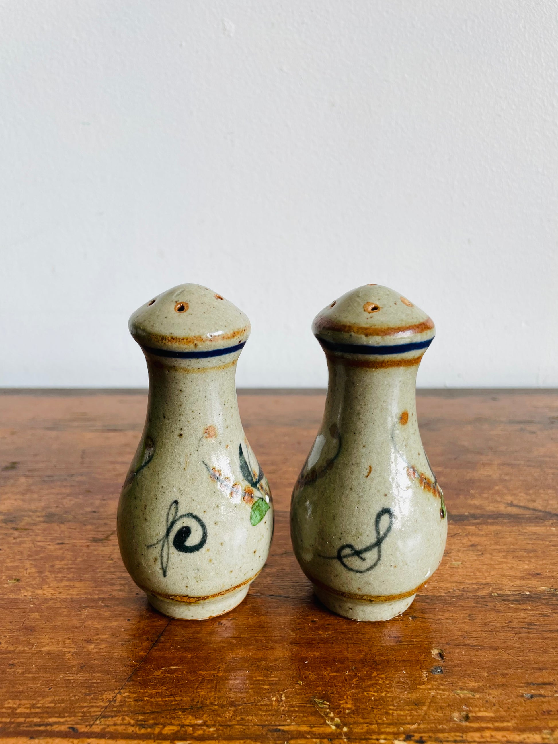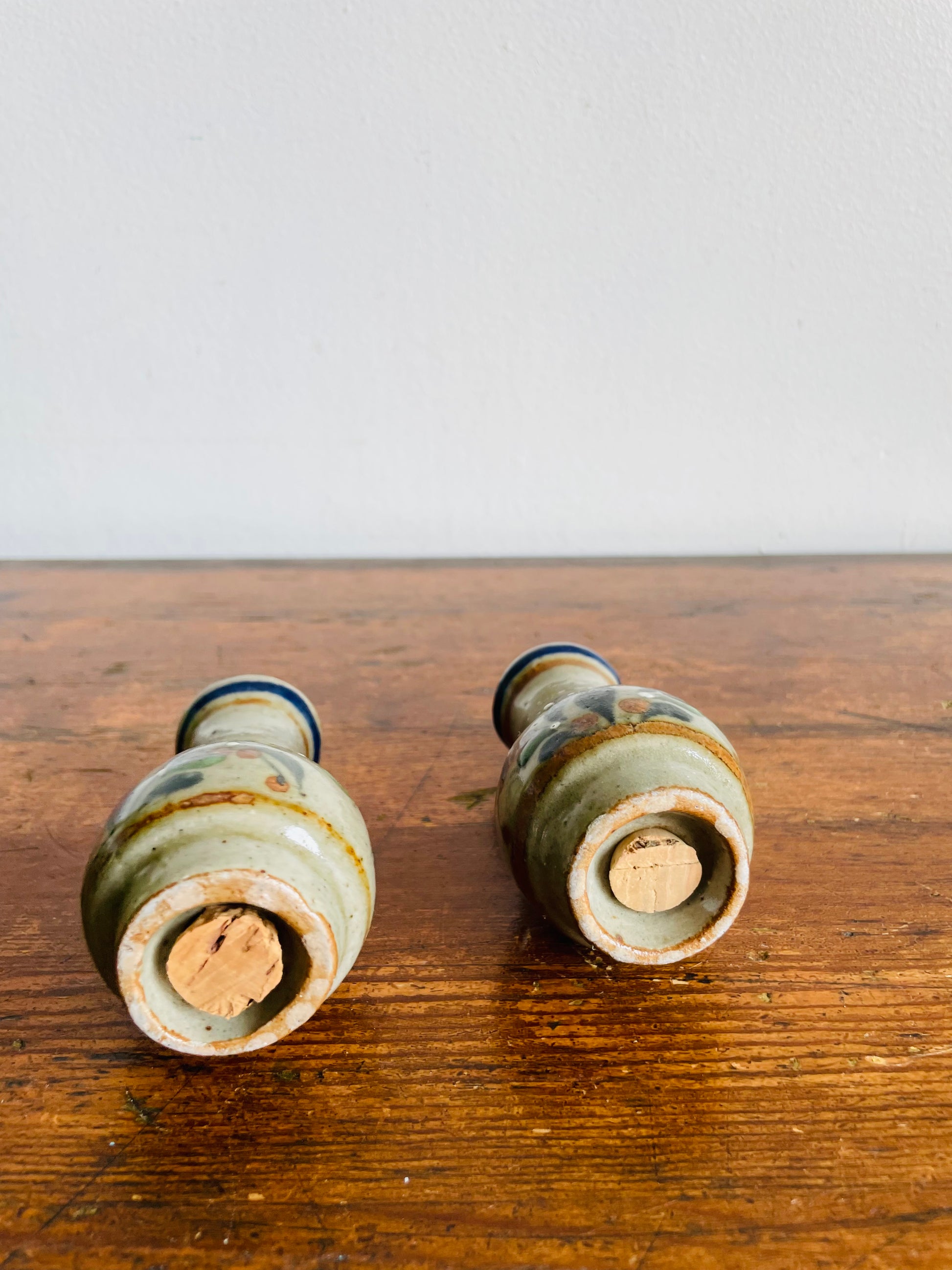 A pair of salt and pepper shakers which have cork bottoms and are signed with initials that look like PA.