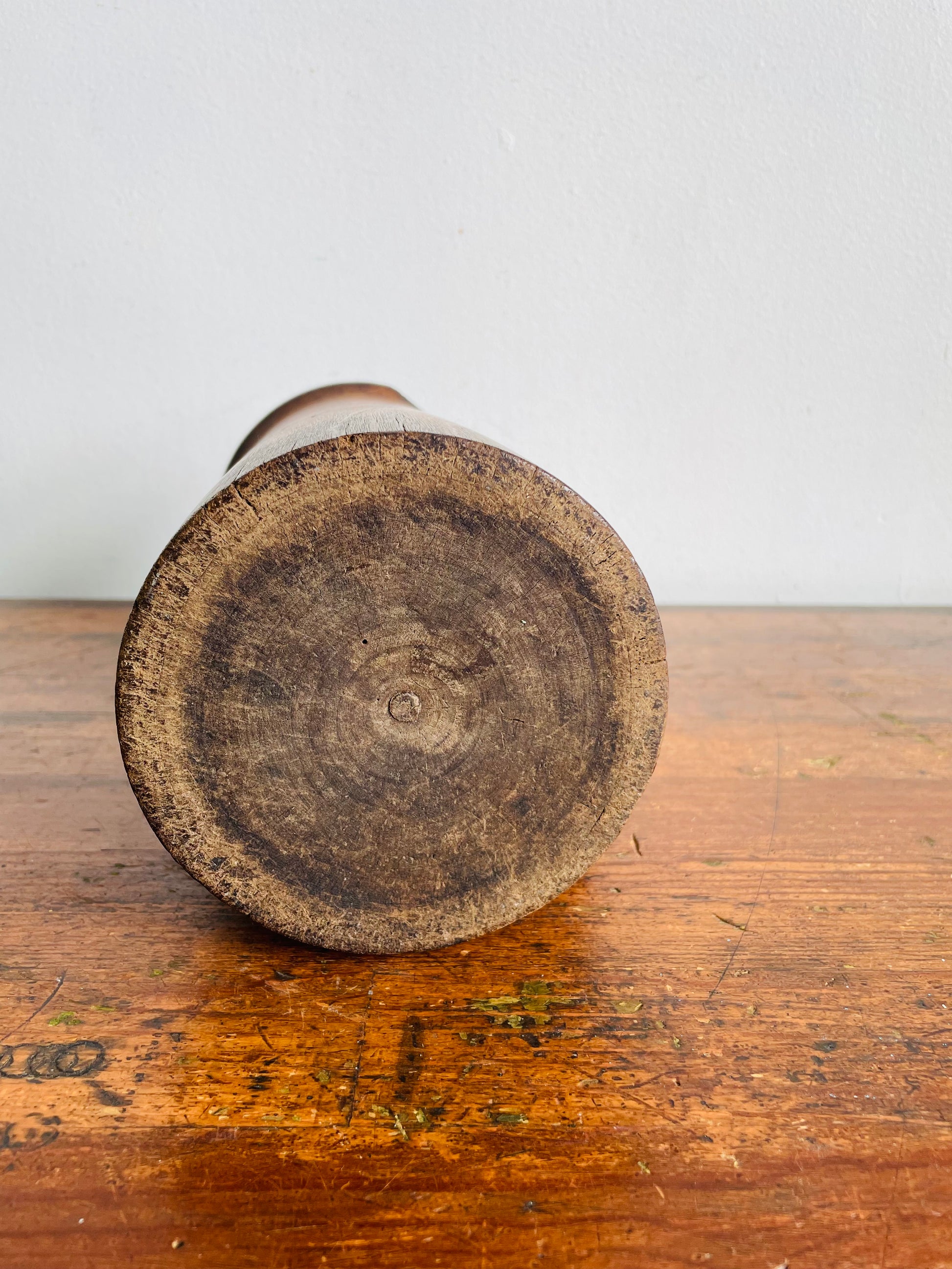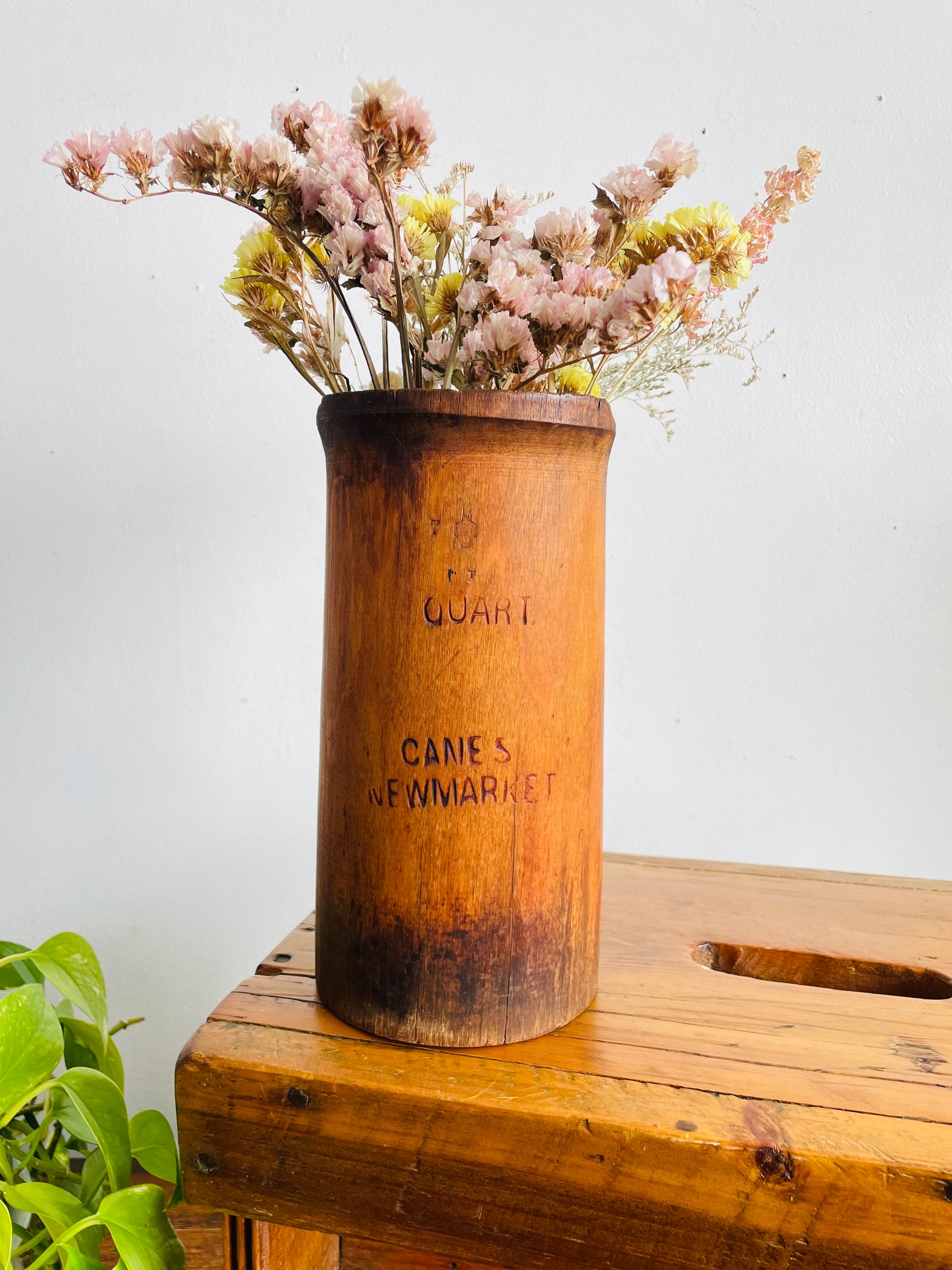 The entire pitcher is made from a hollowed out trunk of a tree and the handle is attached separately. It would make a great piece of decor as-is or you could use it as a vase.
