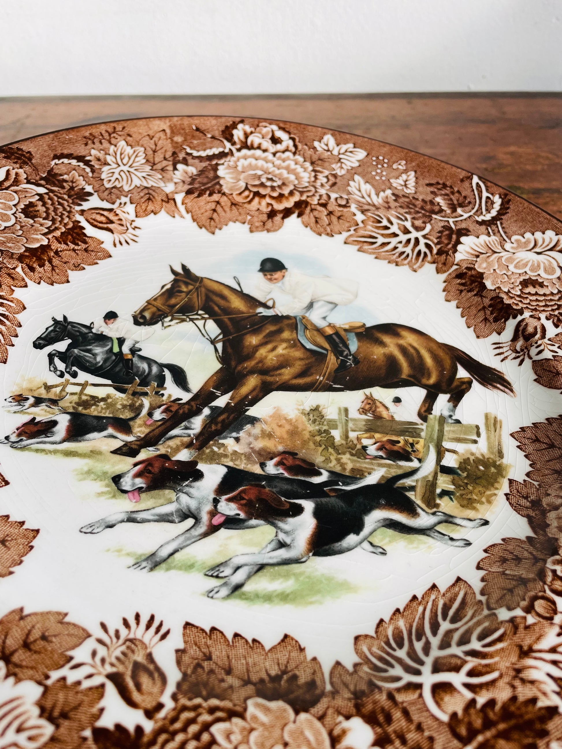 Vintage Wood & Sons Alpine White Ironstone Plate with Brown Flowers, Equestrian / Horse Riders & Dog Design - Made in England
