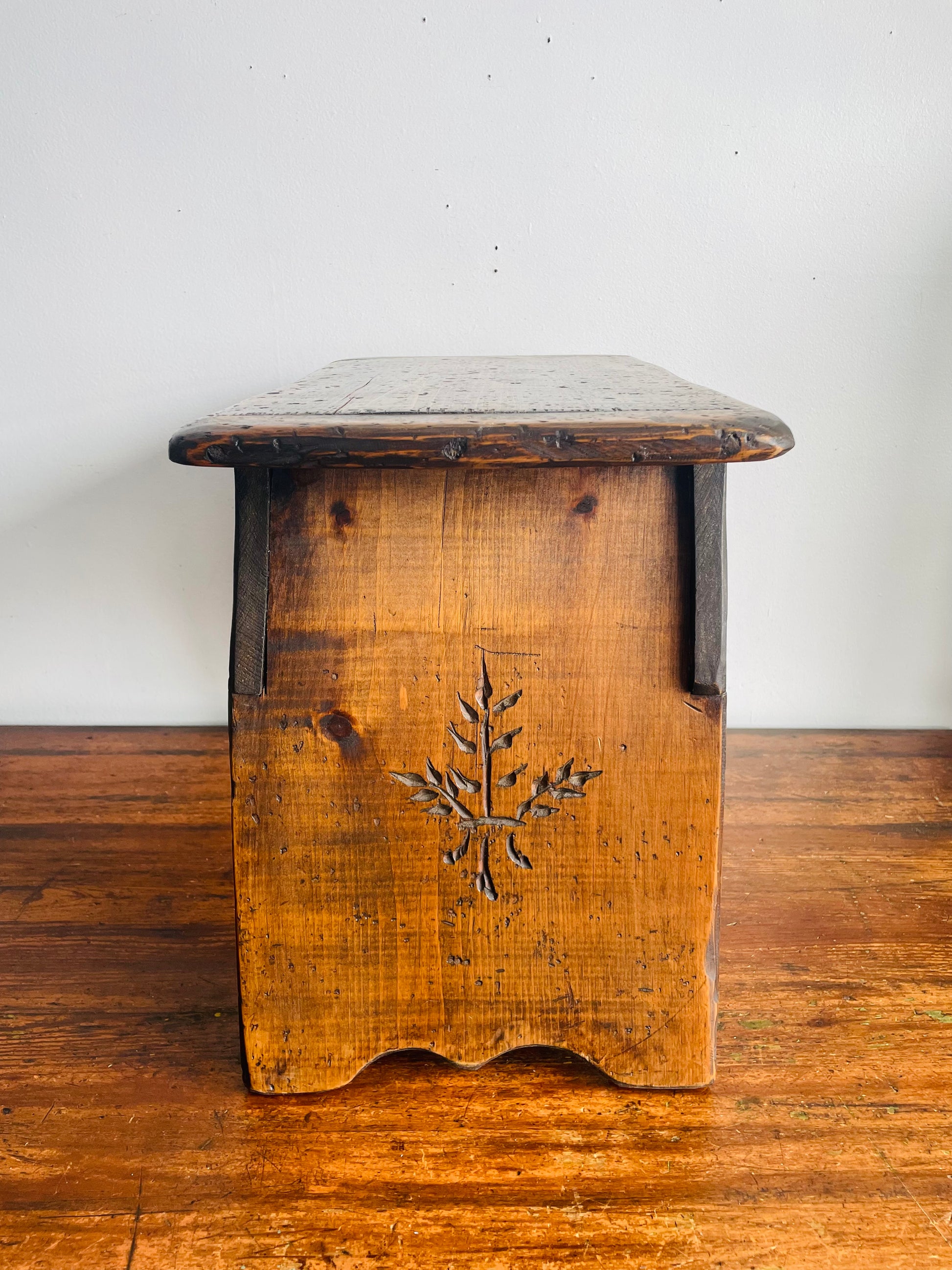 A beautiful piece with nice patina and a carving of a bird and leaves on the front and back and then leaves carved on the sides.
