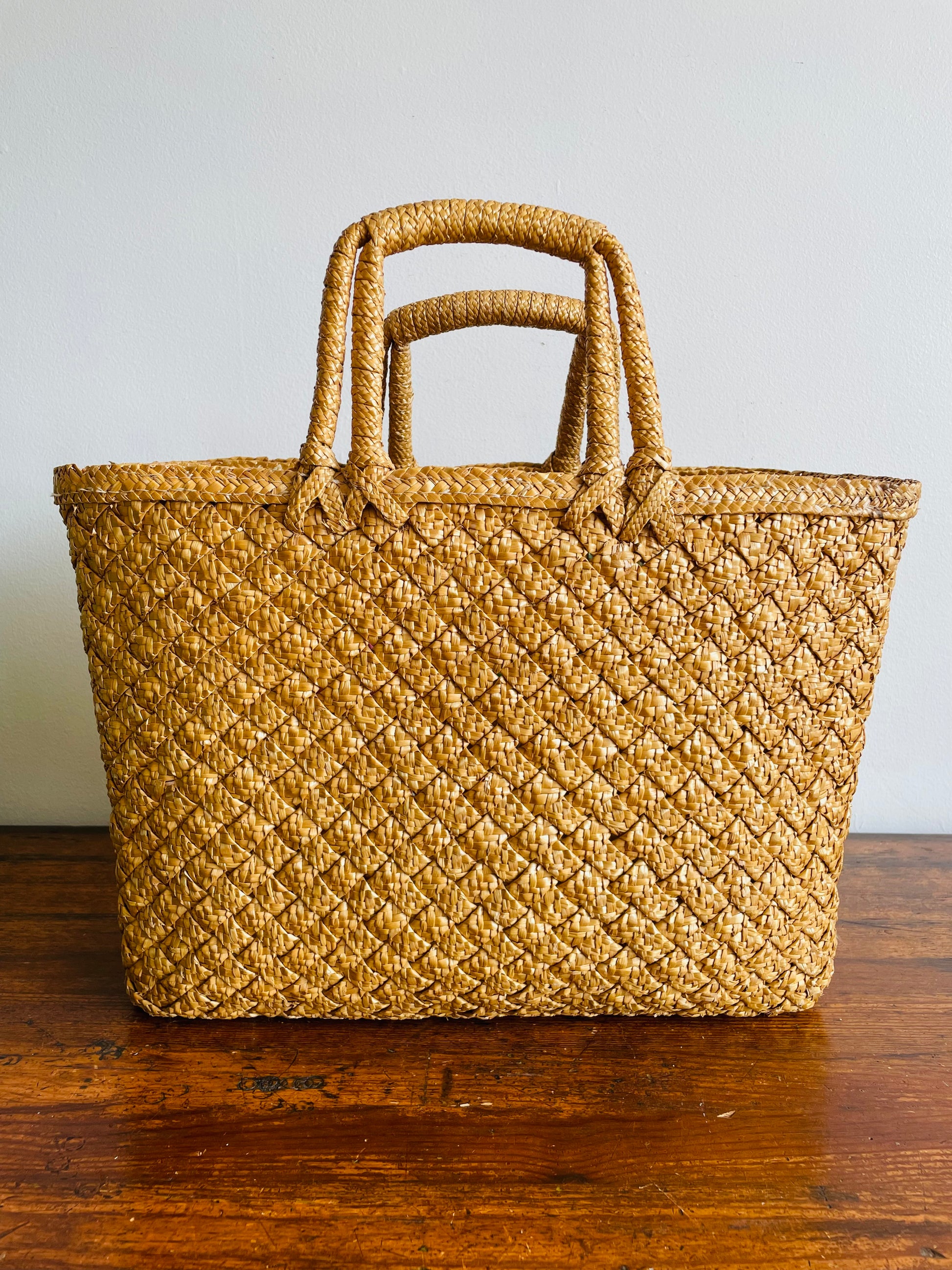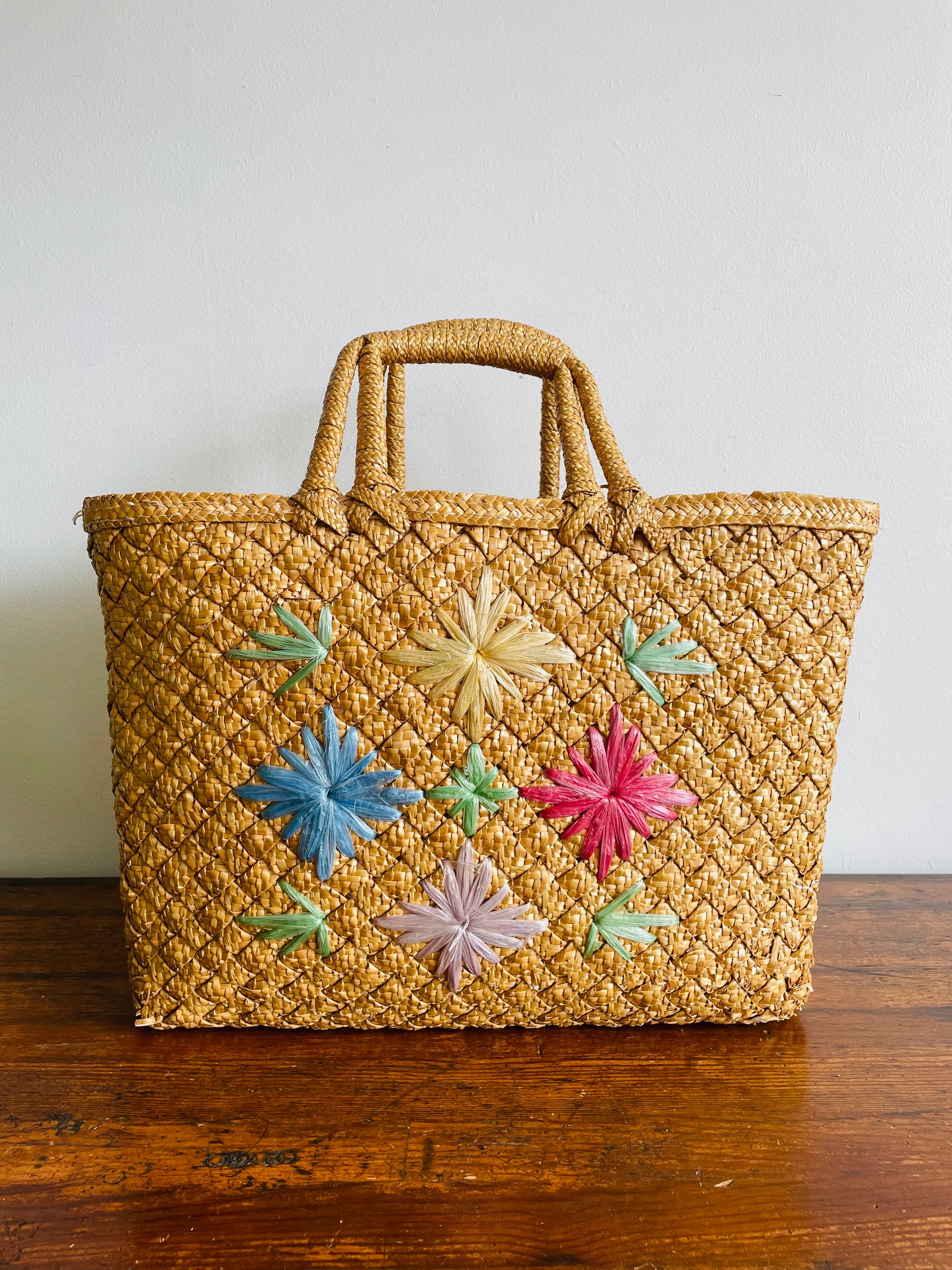 Woven Straw Beach Bag Purse with Raffia Starburst Flower Design