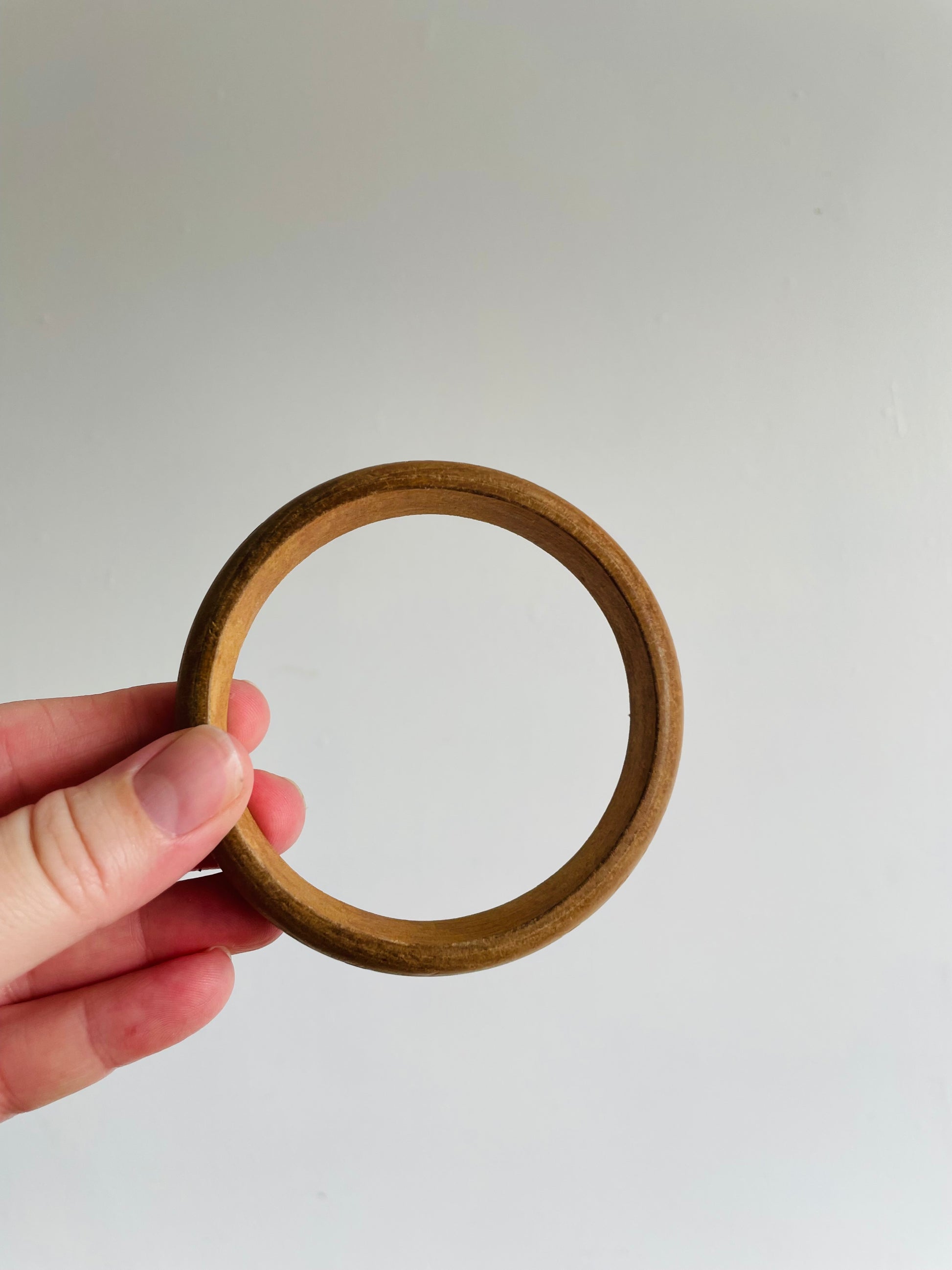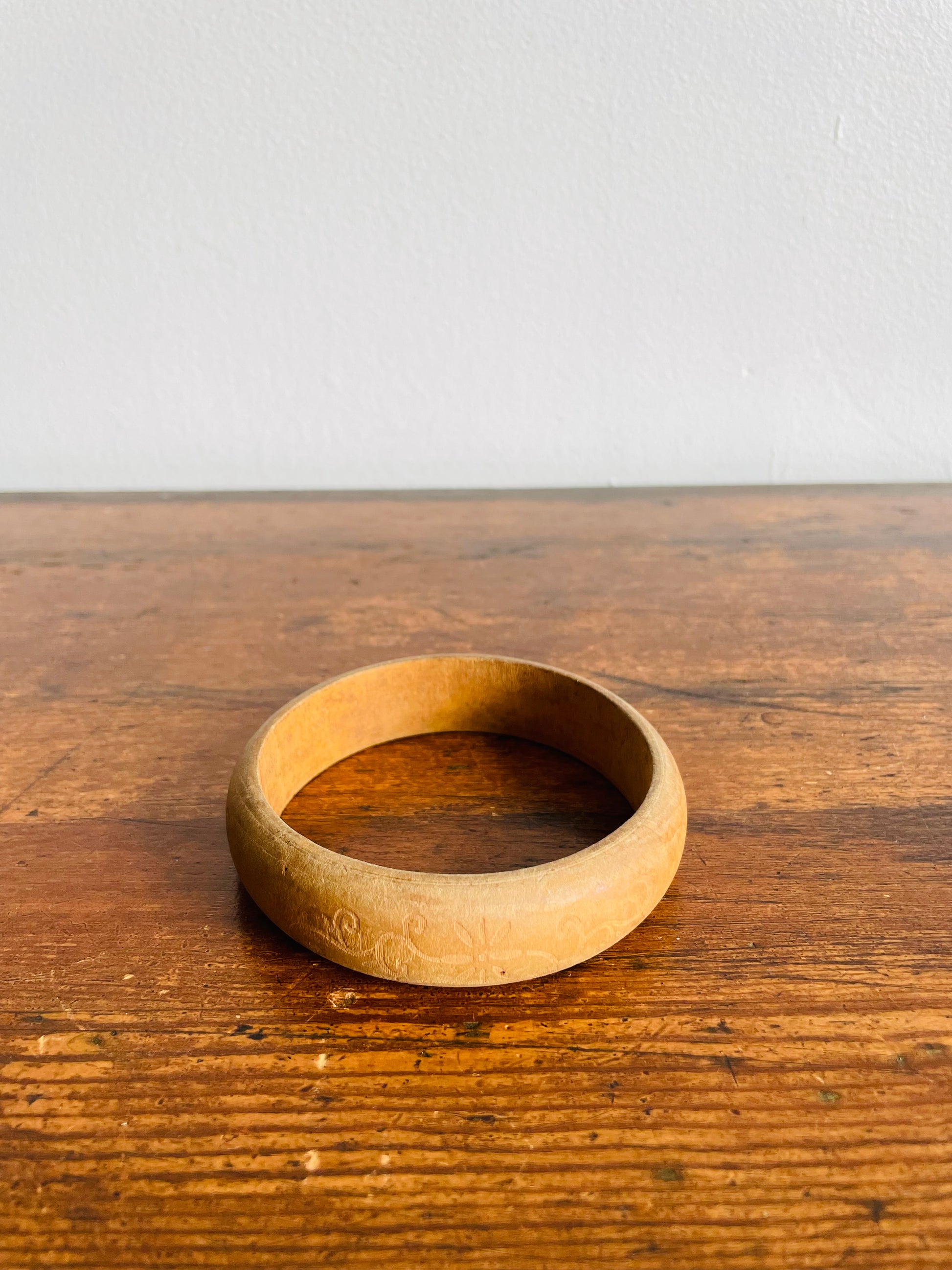 A pretty wooden bangle bracelet that has an etched design of flowers and leaves.